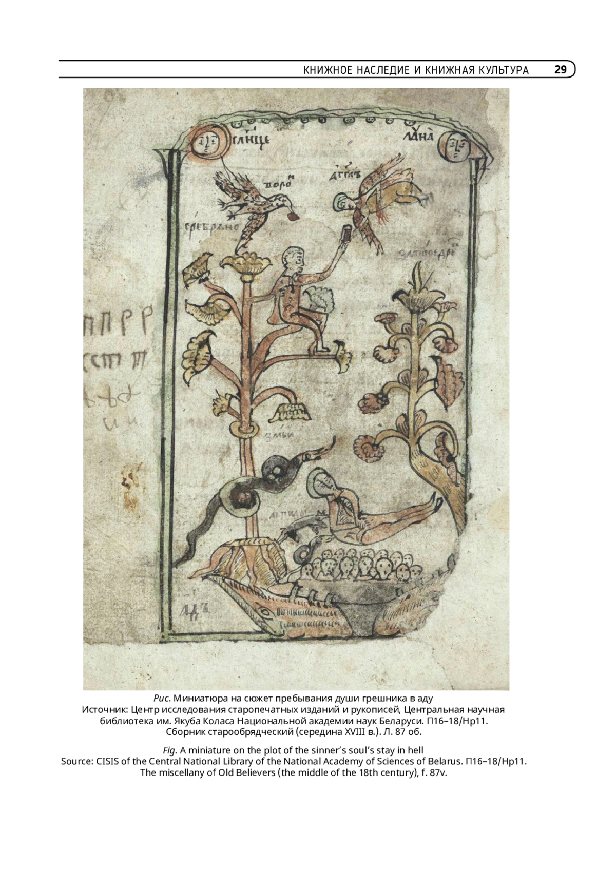 Цель статьи – реконструкция рецепции изображения через прочтение текста и семантики цветов иллюстрации человеком XVIII в. как ­носителем семиотических и семантических кодов историко-культурной традиции. Статья раскрывает внешние представления старообрядцев о загробном мире через описание изображенного на миниатюре сюжета пребывания души грешника в аду, а также представляет собой попытку прочтения и раскрытия семантики встречающихся образов. Важное место в публикации занимает исследование восприятия цвета и его роли в описании образов. Дан краткий обзор дореволюционной, советской и современной историографии, посвященной междисциплинарным пересечениям по этой тематике, актуализировано проблемное поле и сформирован теоретический фундамент исследования. Описана содержащаяся в рукописи миниатюра, раскрыта ее сюжетно-композиционная основа, действующие лица, связь рукописной миниатюры с книжной традицией древней и средневековой Руси.