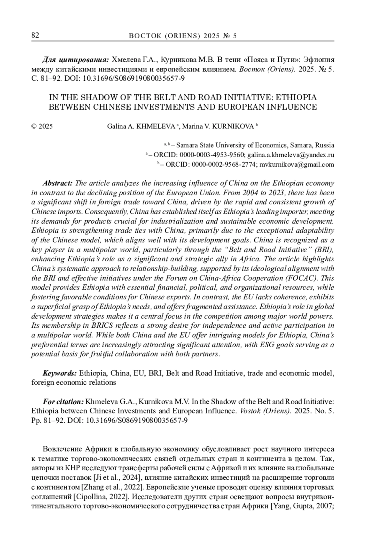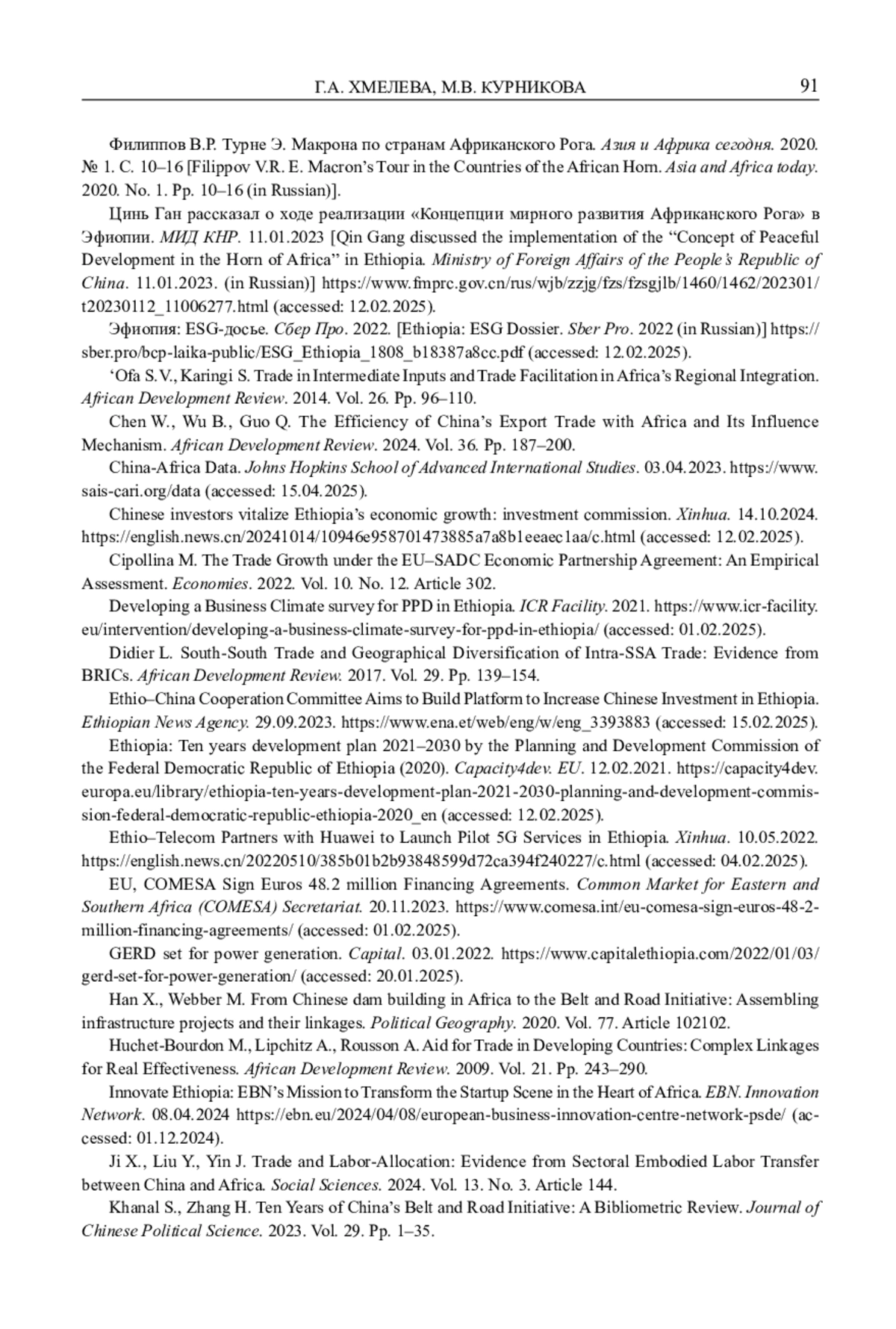 ХМЕЛЕВА Г. А., КУРНИКОВА М. В. В ТЕНИ «ПОЯСА И ПУТИ»: ЭФИОПИЯ МЕЖДУ КИТАЙСКИМИ ИНВЕСТИЦИЯМИ И ЕВРОПЕЙСКИМ ВЛИЯНИЕМ1 // ВОСТОК. АФРО-АЗИАТСКИЕ ОБЩЕСТВА: ИСТОРИЯ И СОВРЕМЕННОСТЬ. 2025. № 5