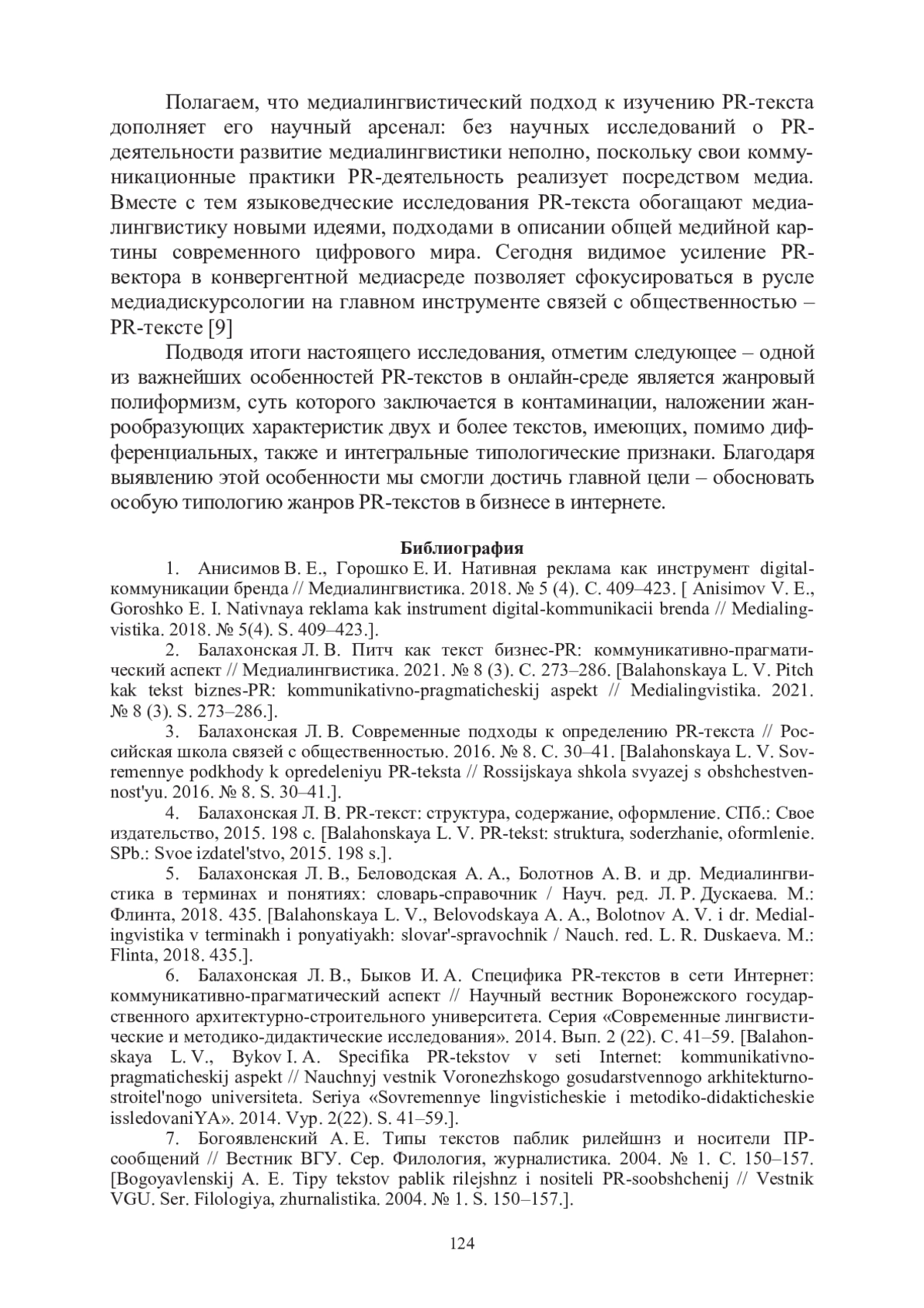 6. Балахонская Л. В., Быков И. А. Специфика PR-текстов в сети Интернет: коммуникативно-прагматический аспект // Научный вестник Воронежского государственного архитектурно-строительного университета. Серия “Современные лингвистические и методико-дидактические исследования”. 2014. Вып. 2 (22). С. 41-59.