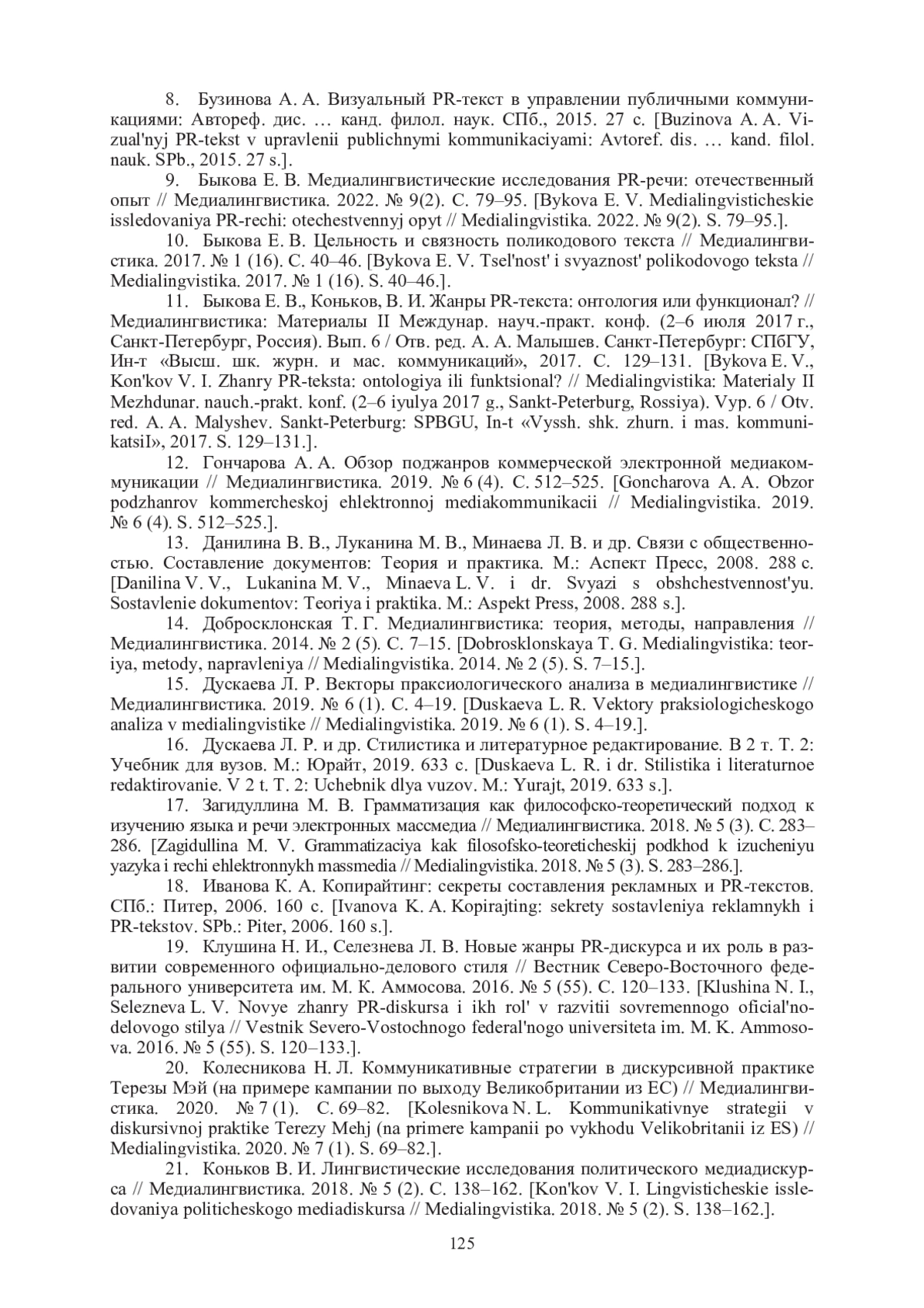 9. Быкова Е. В. Медиалингвистические исследования PR-речи: отечественный опыт // Медиалингвистика. 2022. № 9(2). С. 79-95. EDN: KLVYUL