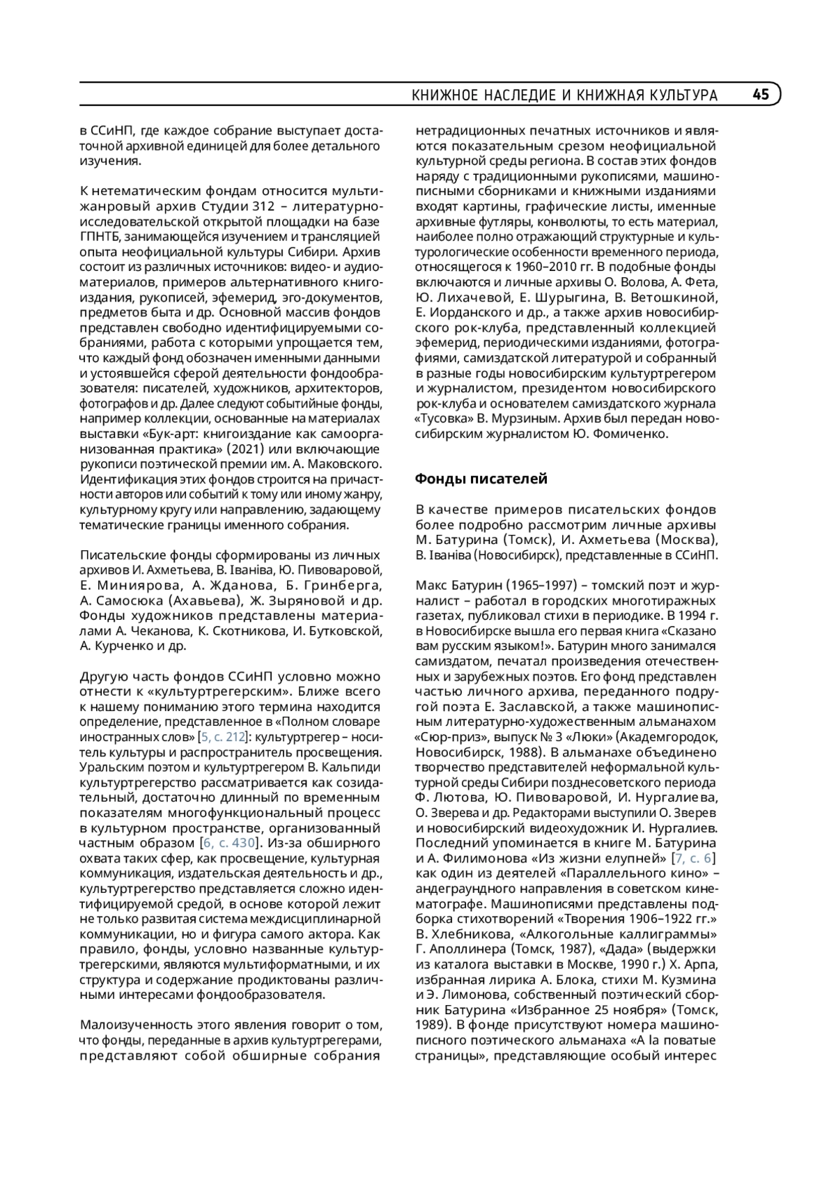 Цель статьи – представить структуру формирования общего архива сектора самиздата и нетрадиционной печати лаборатории книговедения ГПНТБ СО РАН на примере основных единиц хранения – именных фондов писателей, художников, культуртрегеров, музыкантов. В статье приведена классификация имеющихся в фондах сектора неопубликованных источников, проанализировано наличие авторских материалов, дарственных надписей, автографов, рисунков и помет, упоминание авторов и участников процесса альтернативной печати в периодике и переписке. Описаны имеющиеся в секторе источники самиздата и экземпляры нетрадиционной печати, раскрывается содержание тематических направлений. Охарактеризованы архивные единицы на примере образцов альтернативного книгоиздания, различных форм самиздата, эфемерид, эгодокументов, фрагментов личных библиотек, материалов периодической печати. Представлена классификация именных фондов по временной периодизации, тематическим и территориальным характеристикам. На примере личных собраний М. Батурина, И. Ахметьева, В. Iванiва, О. Волова, Е. Шурыгина, Е. Иорданского, А. Чеканова, а также различных неофициальных творческих сообществ и групп проводится анализ содержания представленных источников. Особое внимание уделяется формированию коммуникационных цепочек и связей между авторами в неформальной культурной среде, области самиздата и альтернативного книгоиздания 1960–2010-х гг., выясняются критерии выстраивания подобных взаимосвязей.