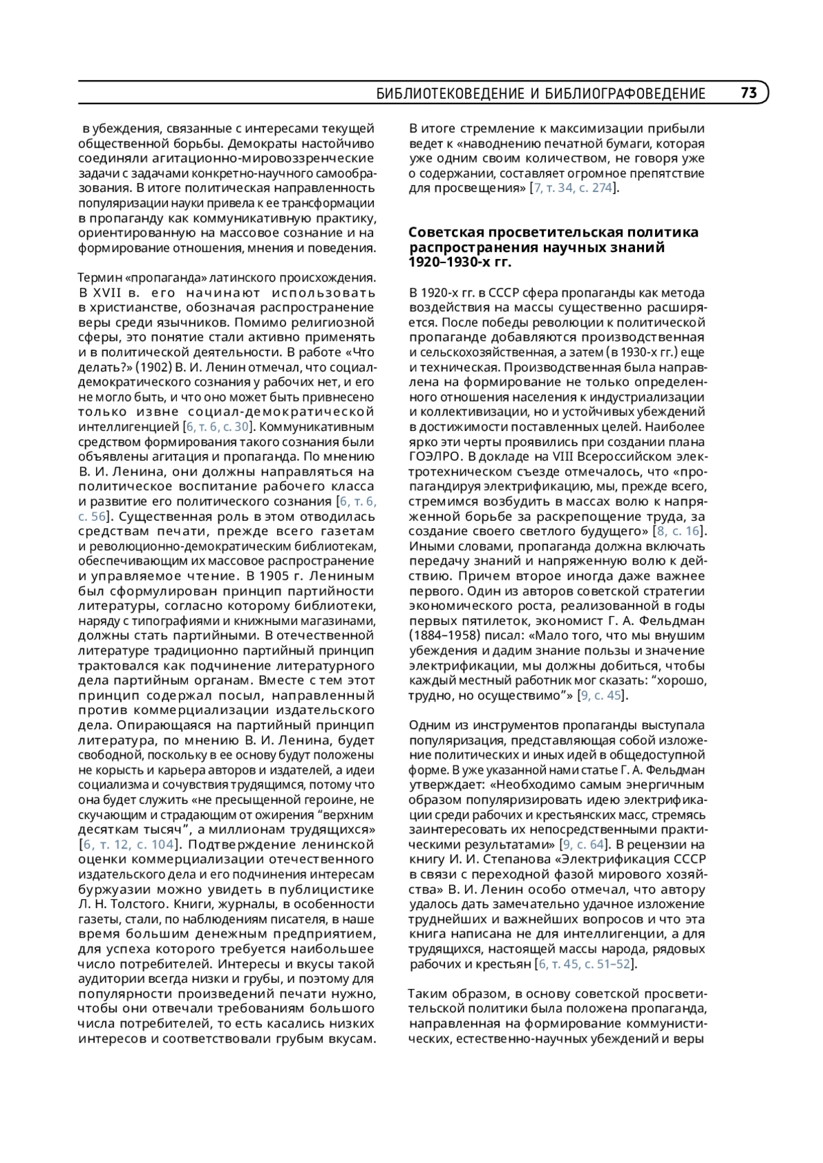 Целью статьи является критический анализ исторического опыта по формированию просветительской советской государственной библиотечной политики в 1920–1930‑х гг. и определение возможностей его современного использования. Показано, что основу этой политики составили взгляды на науку и ее популяризацию отечественных революционных демократов, а также идеи В. И. Ленина о политическом воспитании рабочего класса и развитии его политического сознания. Отмечено, что библиотечная просветительская политика начала складываться в рамках просветительской концепции библиотечного дела как одной из форм внешкольного образования и политической пропаганды в конце XIX – начале XX в., однако политические и организационные условия для ее реализации сложились только в советское время. Основным мотивом формирования советской просветительской политики стала необходимость подготовки рабочих и крестьян к участию в государственном управлении по всей вертикали власти, борьба с церковью, а также повышение технической и сельскохозяйственной грамотности рабочих и крестьян. Базовой формой взаимодействия стала пропаганда как наиболее концентрированное выражение политического, научного и технического просвещения. Раскрыты политические и педагогические принципы этой политики и сделаны выводы о перспективности использования опыта тех лет при формировании современной библиотечной политики по организации взаимодействия науки и общества. Проанализированы основные достижения и недостатки. Опыт 1920–1930-х гг. показывает, что такая политика станет успешной при реализации следующих условий: 1) библиотечная политика в этом направлении будет составной частью общегосударственной просветительской и научной политики; 2) будет организовано управление просветительским и научным чтением; 3) библиотечное воздействие должно носить активный характер; 4) принципы современной просветительской библиотечной политики модернизируются с учетом достижений педагогической науки в области просветительства, социологии чтения, информационной культуры и популяризации науки.