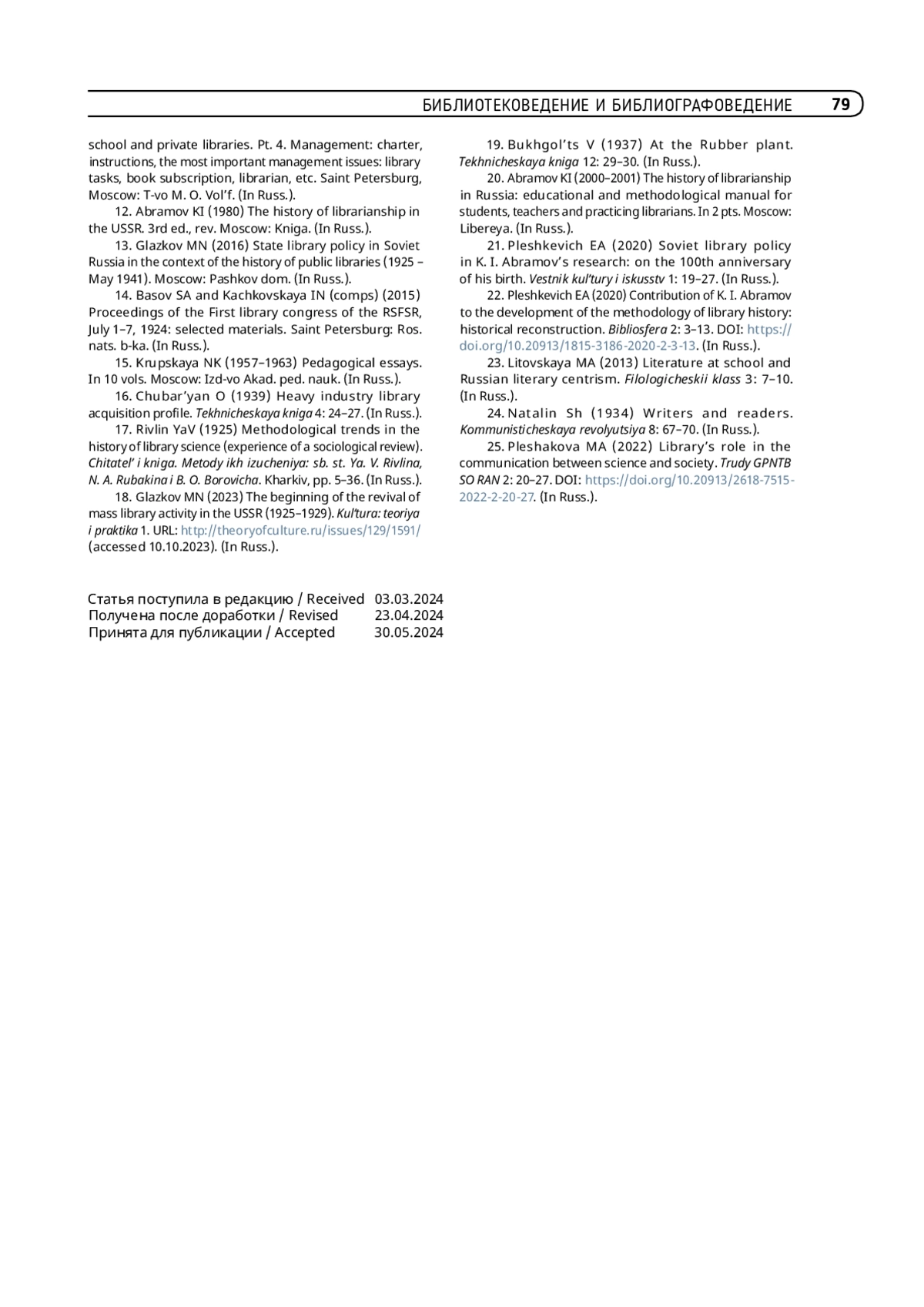 5. Плешкевич Е. А. Государственно ориентированная советская модель библиотечного обеспечения коммуникации науки и общества // Библиосфера. 2023. № 1. С. 7-13. https://doi.org/10.20913/1815-3186-2023-1-7-13.