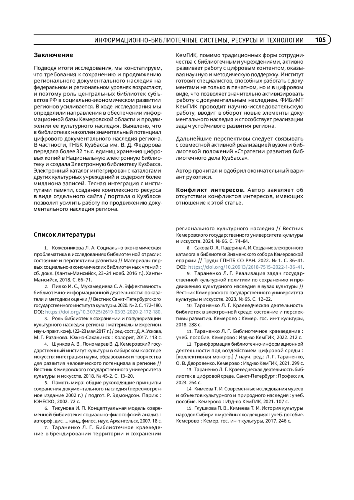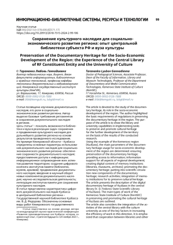 Статья: Сохранение культурного наследия для социально-экономического развития региона: опыт центральной библиотеки субъекта РФ и вуза культуры (2024)