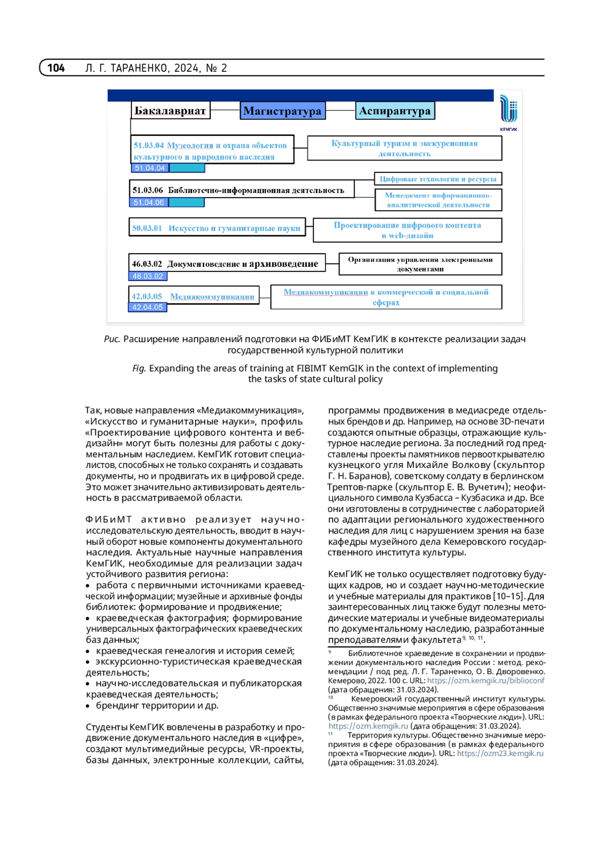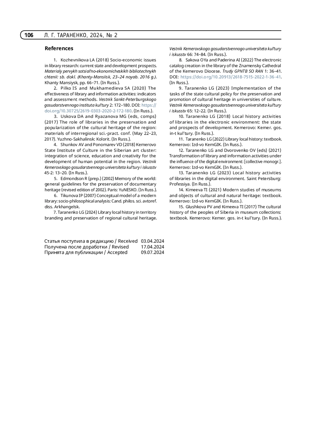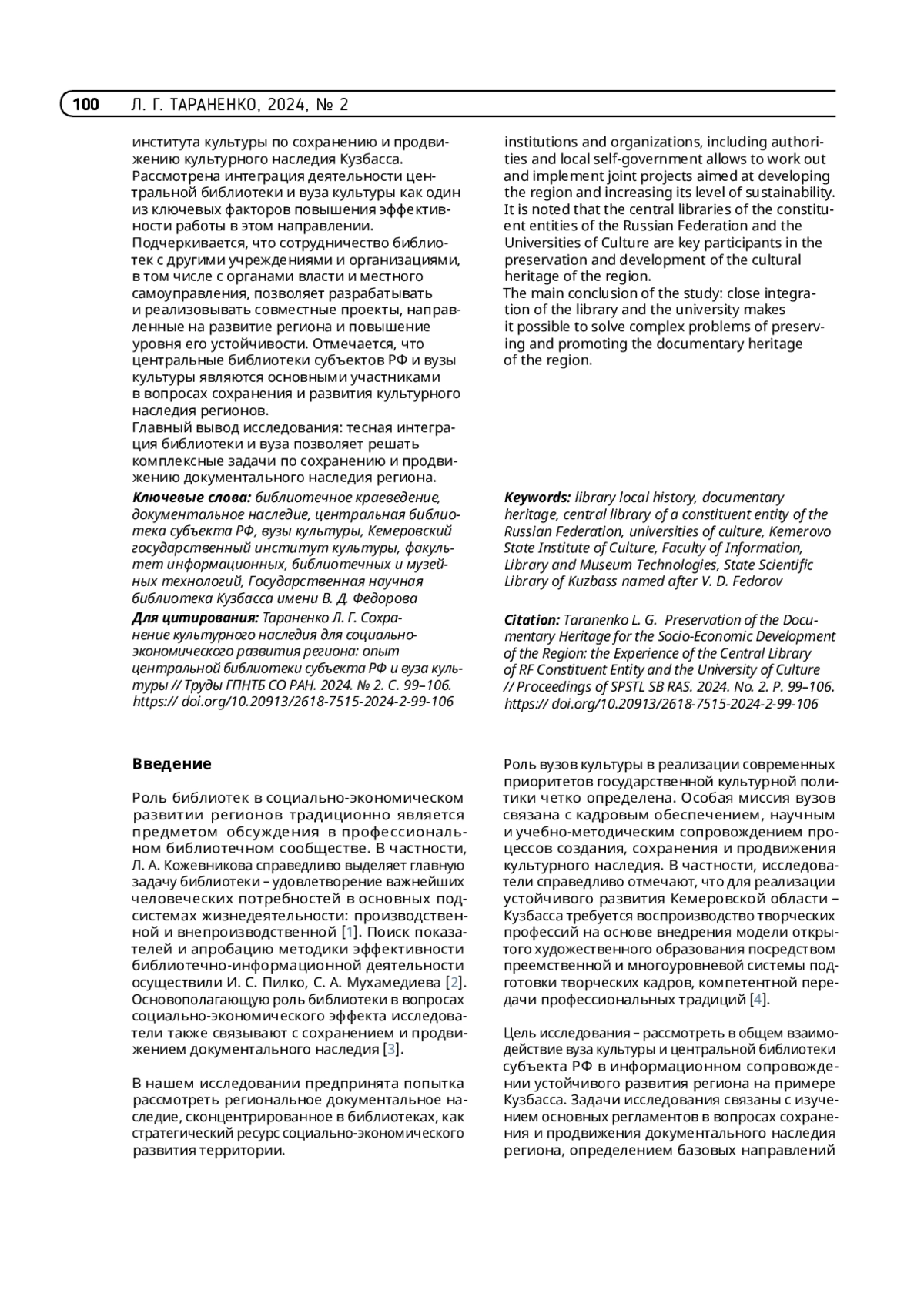 ТАРАНЕНКО Л. Г. СОХРАНЕНИЕ КУЛЬТУРНОГО НАСЛЕДИЯ ДЛЯ СОЦИАЛЬНО-ЭКОНОМИЧЕСКОГО РАЗВИТИЯ РЕГИОНА: ОПЫТ ЦЕНТРАЛЬНОЙ БИБЛИОТЕКИ СУБЪЕКТА РФ И ВУЗА КУЛЬТУРЫ // ТРУДЫ ГПНТБ СО РАН. 2024. № 2