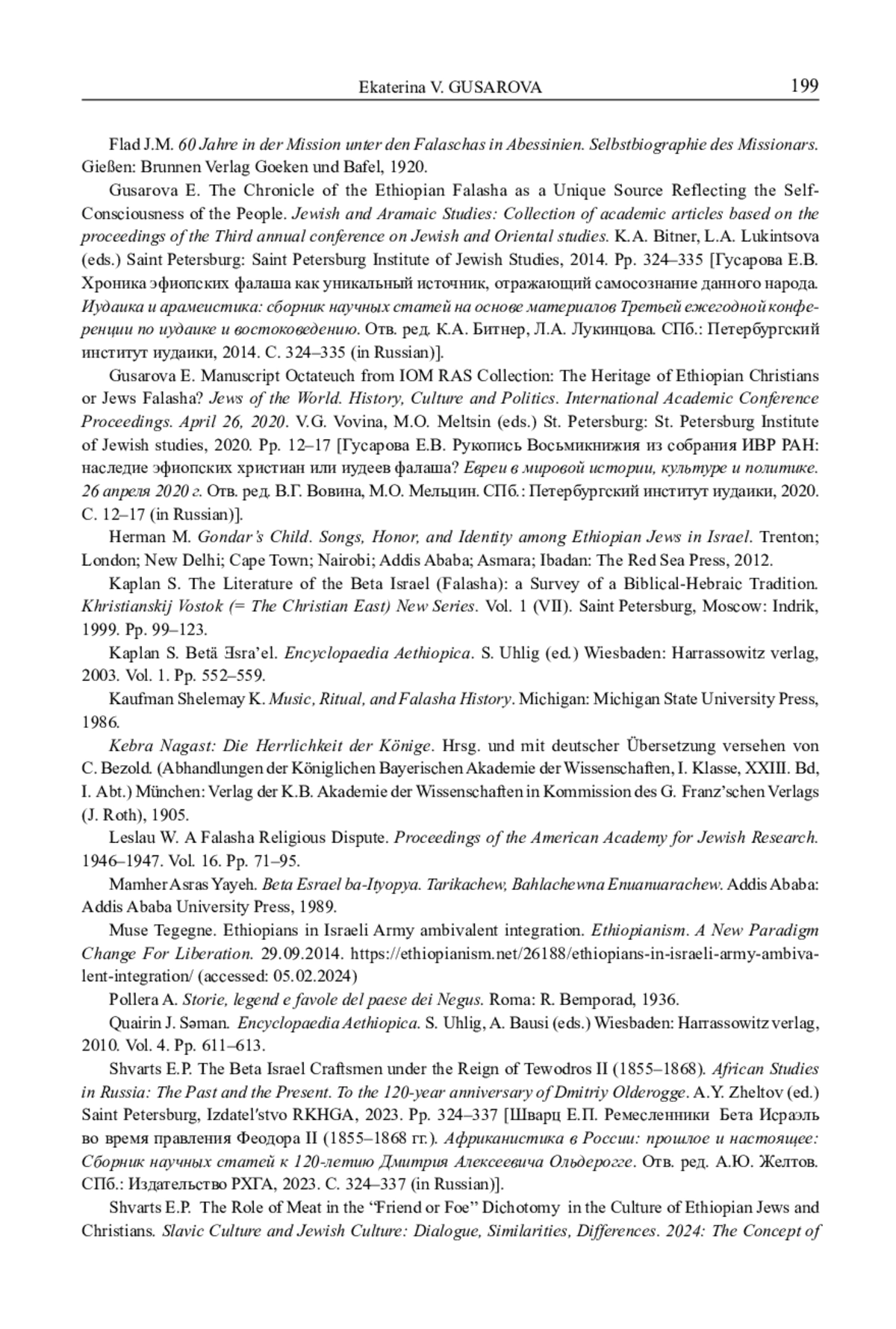1. Gusarova E.V. The chronicle of the Ethiopian Falasha as a unique source reflecting the self-awareness of this people. Judaica and Aramaic Studies: a collection of scientific articles based on the materials of the Third Annual Conference on Judaica and Oriental Studies. K.A. Bitner, L.A. Lukintsova (editors) St. Petersburg: St. Petersburg Institute of Judaica, 2014. pp. 324-335. EDN: TZTHSB
