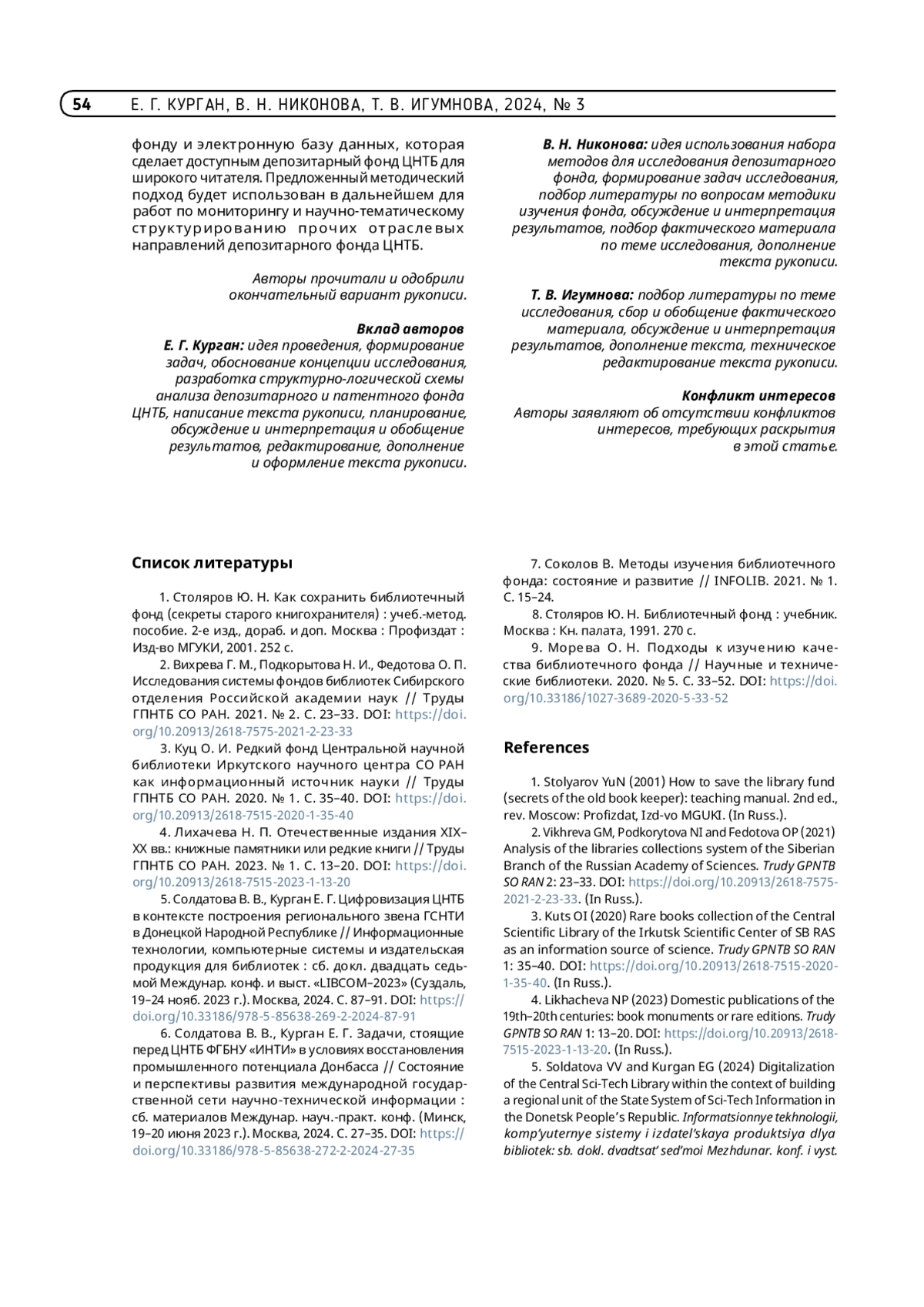 7. Соколов В. Методы изучения библиотечного фонда: состояние и развитие // INFOLIB. 2021. № 1. С. 15-24.