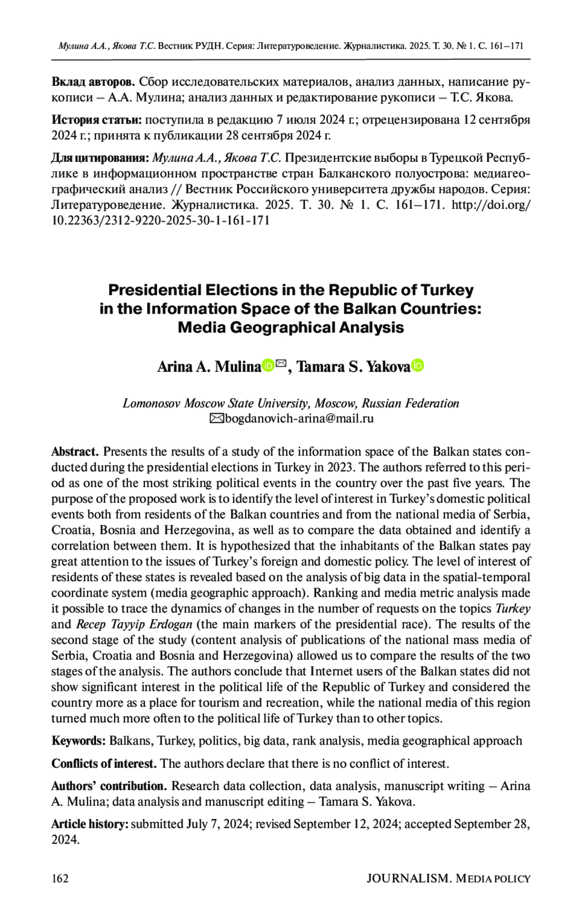 Цель работы - установить уровень интереса к внутриполитическим событиям Турции как со стороны жителей Балканского полуострова, так и со стороны национальных СМИ Сербии, Хорватии, Боснии и Герцеговины, а также сравнить полученные данные, выявить корреляцию между ними. Выдвигается гипотеза, что граждане балканских государств уделяют большое внимание вопросам внешней и внутренней политики Турции. Однако уровень их интереса - анализ больших данных в пространственно-временной системе координат (медиагеографический подход). Ранговый и медиаметрический анализ позволяют проследить динамику изменения количества запросов по темам «Турция» и «Реджеп Тайип Эрдоган» - основным маркерам президентской гонки. Результаты второго этапа исследования (контент-анализ публикаций национальных массмедиа Сербии, Хорватии, Боснии и Герцеговины) позволяют сопоставить итоги двух этапов анализа. Авторы приходят к выводу, что интернет-пользователи балканских государств не проявили значительного интереса к политической жизни Турецкой Республики и рассматривали указанную страну в большей степени как место для туризма и отдыха, в то время как национальные СМИ этого региона значительно чаще обращались к политической жизни Турции, чем к другим темам.