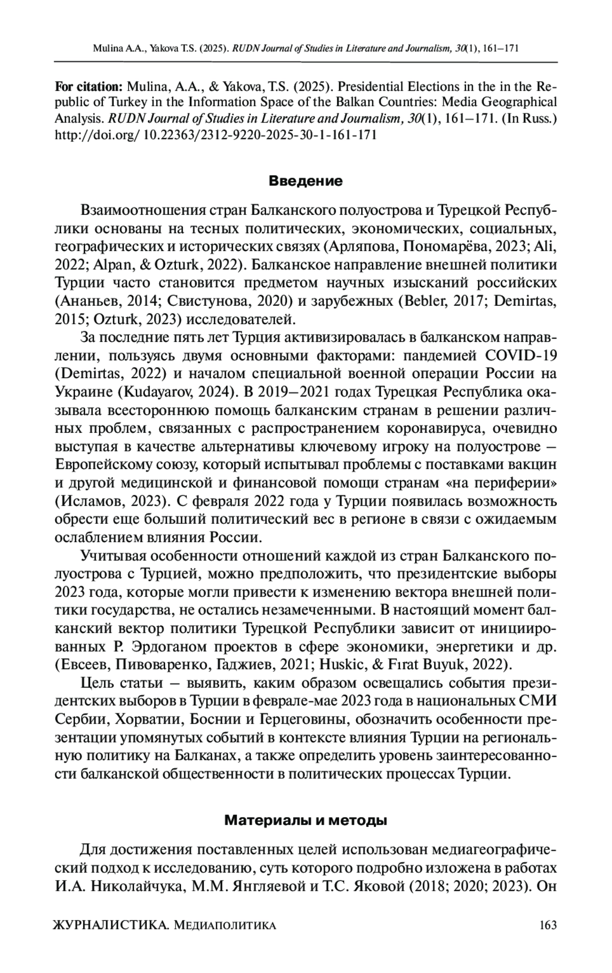 Взаимоотношения стран Балканского полуострова и Турецкой Республики основаны на тесных политических, экономических, социальных, географических и исторических связях (Арляпова, Пономарёва, 2023; Ali, 2022; Alpan, & ozturk, 2022). Балканское направление внешней политики Турции часто становится предметом научных изысканий российских (Ананьев, 2014; Свистунова, 2020) и зарубежных (Bebler, 2017; Demirtas, 2015; ozturk, 2023) исследователей.