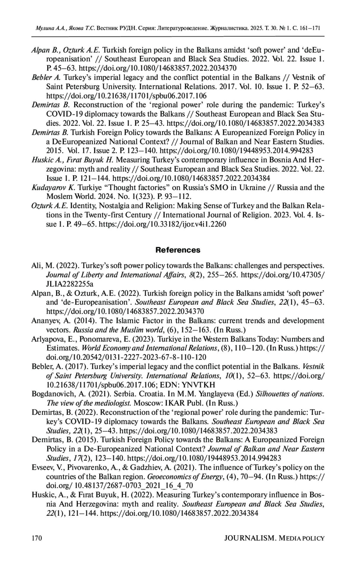 13. Alpan B., Ozturk A.E. Turkish foreign policy in the Balkans amidst ‘soft power’ and ‘deEuropeanisation’ // Southeast European and Black Sea Studies. 2022. Vol. 22. Issue 1. P. 45-63. DOI: 10.1080/14683857.2022.2034370