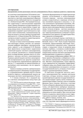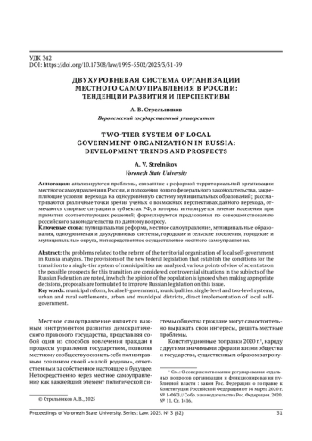 СТРЕЛЬНИКОВ А.В. ДВУХУРОВНЕВАЯ СИСТЕМА ОРГАНИЗАЦИИ МЕСТНОГО САМОУПРАВЛЕНИЯ В РОССИИ: ТЕНДЕНЦИИ РАЗВИТИЯ И ПЕРСПЕКТИВЫ // ВЕСТНИК ВОРОНЕЖСКОГО ГОСУДАРСТВЕННОГО УНИВЕРСИТЕТА. СЕРИЯ: ПРАВО. 2025. № 3 (62) (33 СТ.)