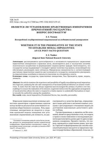 Рассматриваются целесообразность и возможность юридического закрепления нравственных императивов в правовых актах, анализируются роль и последствия усиления политического воздействия на формирование мировоззрения граждан. Констатируется, что государство всегда поддерживает и поощряет примат политики над правом, позволяющий ему обеспечивать реализацию своих интересов. Юридическое вмешательство в соответствующую расстановку нравственных акцентов дает возможность государству своевременно реагировать на нежелательные колебания в лояльности населения по отношению к власти.