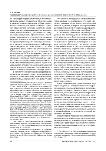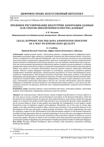 Национальный проект «Экономика данных», направленный на цифровую трансформацию различных сфер, является следующей ступенью для обеспечения научно-технологического суверенитета в Российской Федерации, при этом ключевым моментом для реализации многочисленных направлений, федеральных проектов, мероприятий в рамках национального проекта является повышение качества как данных, так и их наборов, обеспечение роста доступных для использования различными субъектами данных. Вопросы качества данных и особенно управления таким качеством остаются за рамками нормативного обеспечения и регулирования. Между тем одним из способов обеспечения качества данных является индустрия аннотации данных. Многие страны обращают внимание на потенциал, заложенный в развитии данного направления, начинают принимать стратегические документы. В статье обосновывается необходимость нормативного обеспечения развития индустрии аннотации данных в Российской Федерации, рассматриваются зарубежные подходы, которые в настоящее время начинают формироваться в данной сфере, предлагаются направления, которые следует развивать для системного становления индустрии аннотации в России как способа обеспечения качества данных. Обращается внимание на многогранность потенциала аннотации данных, в том числе для обеспечения качества алгоритмов, развития узко специализированных моделей искусственного интеллекта.