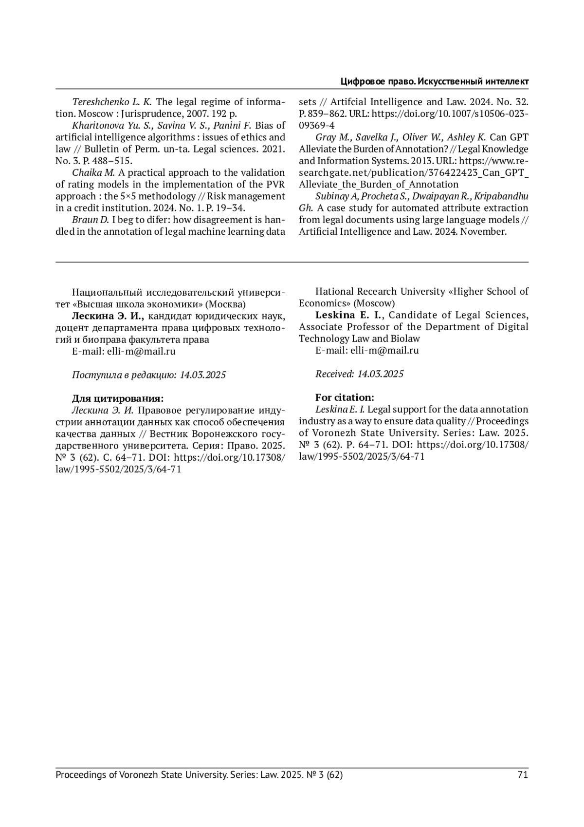 11. Braun D. I beg to difer: how disagreement is handled in the annotation of legal machine learning data sets // Artifcial Intelligence and Law. 2024. No. 32. Р. 839-862. DOI: 10.1007/s10506-023-09369-4