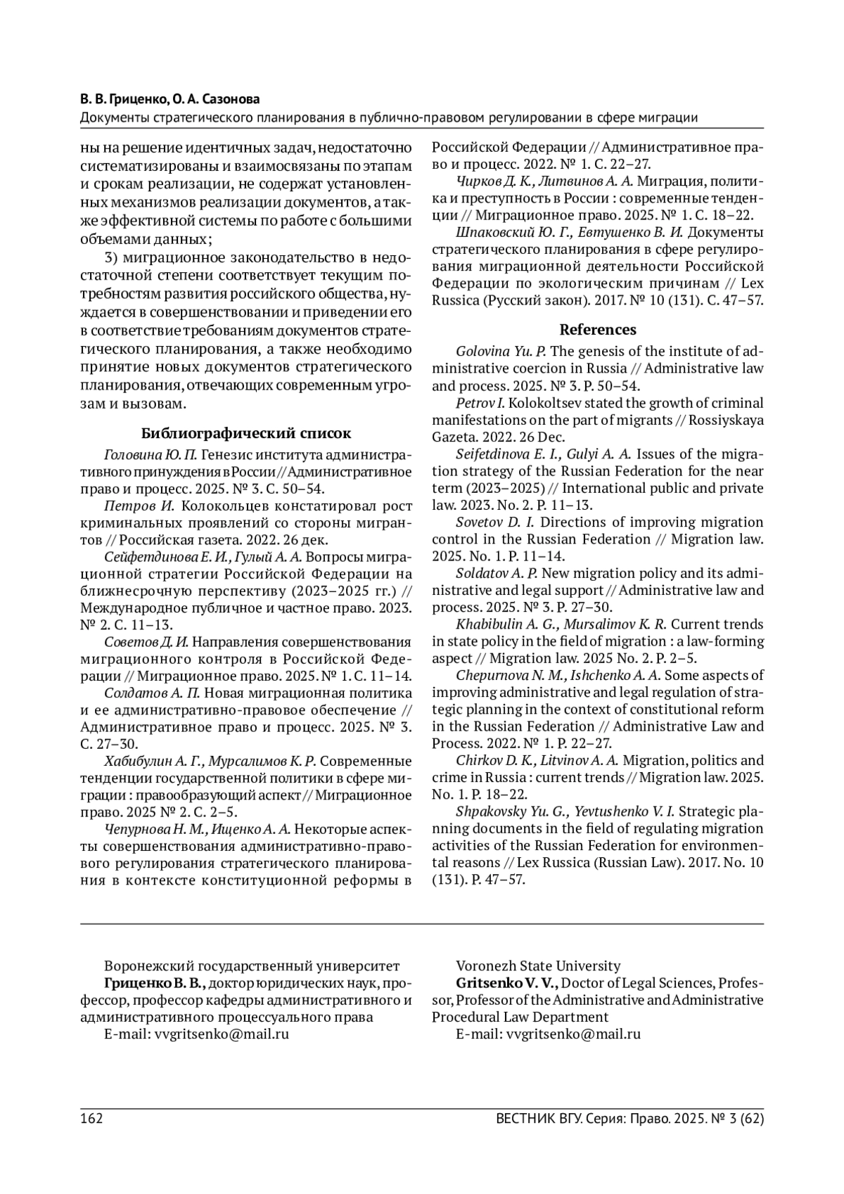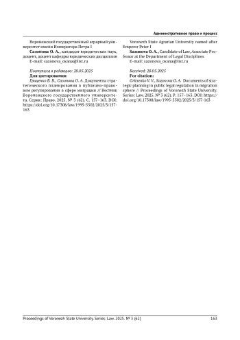 5. Солдатов А. П. Новая миграционная политика и ее административно-правовое обеспечение // Административное право и процесс. 2025. № 3. С. 27-30. EDN: XNQJLC