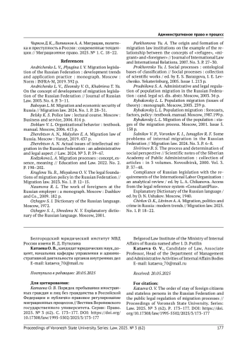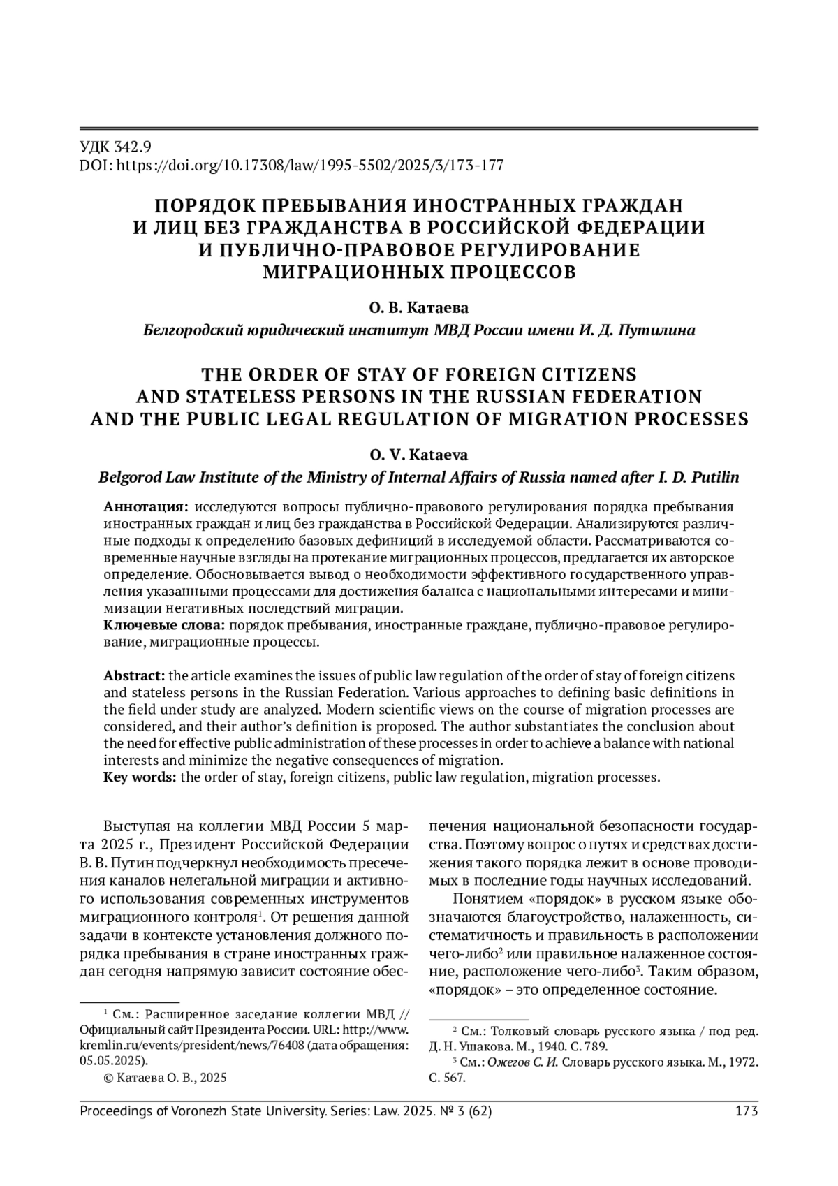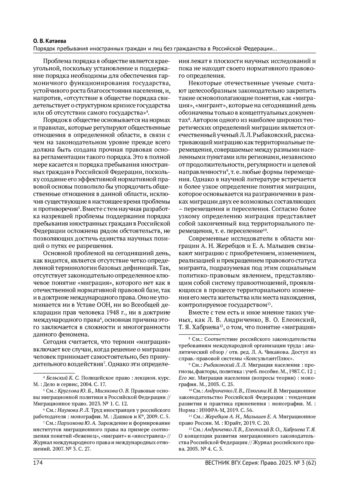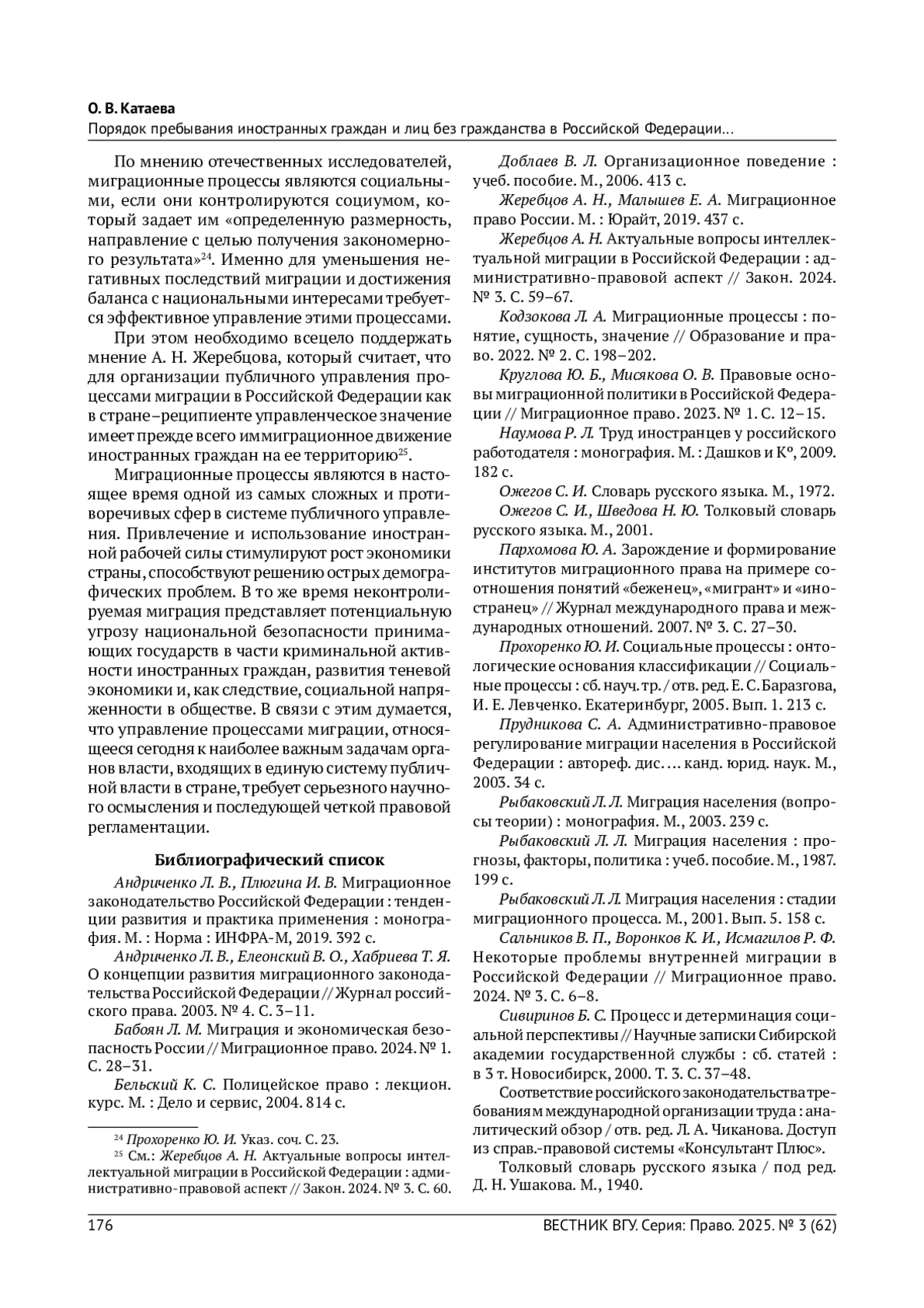КАТАЕВА О.В. ПОРЯДОК ПРЕБЫВАНИЯ ИНОСТРАННЫХ ГРАЖДАН И ЛИЦ БЕЗ ГРАЖДАНСТВА В РОССИЙСКОЙ ФЕДЕРАЦИИ И ПУБЛИЧНО-ПРАВОВОЕ РЕГУЛИРОВАНИЕ МИГРАЦИОННЫХ ПРОЦЕССОВ // ВЕСТНИК ВОРОНЕЖСКОГО ГОСУДАРСТВЕННОГО УНИВЕРСИТЕТА. СЕРИЯ: ПРАВО. 2025. № 3 (62) (33 СТ.)