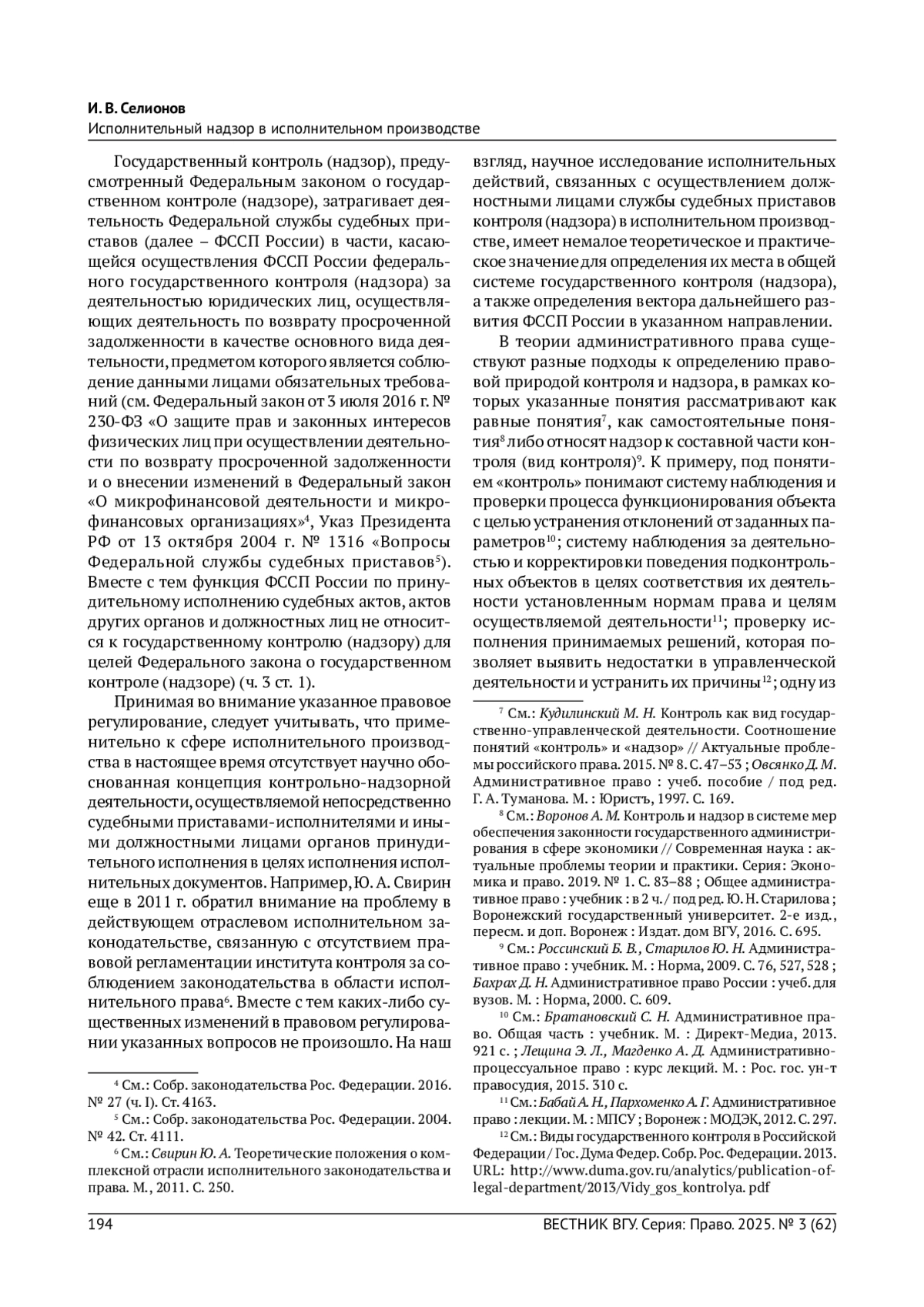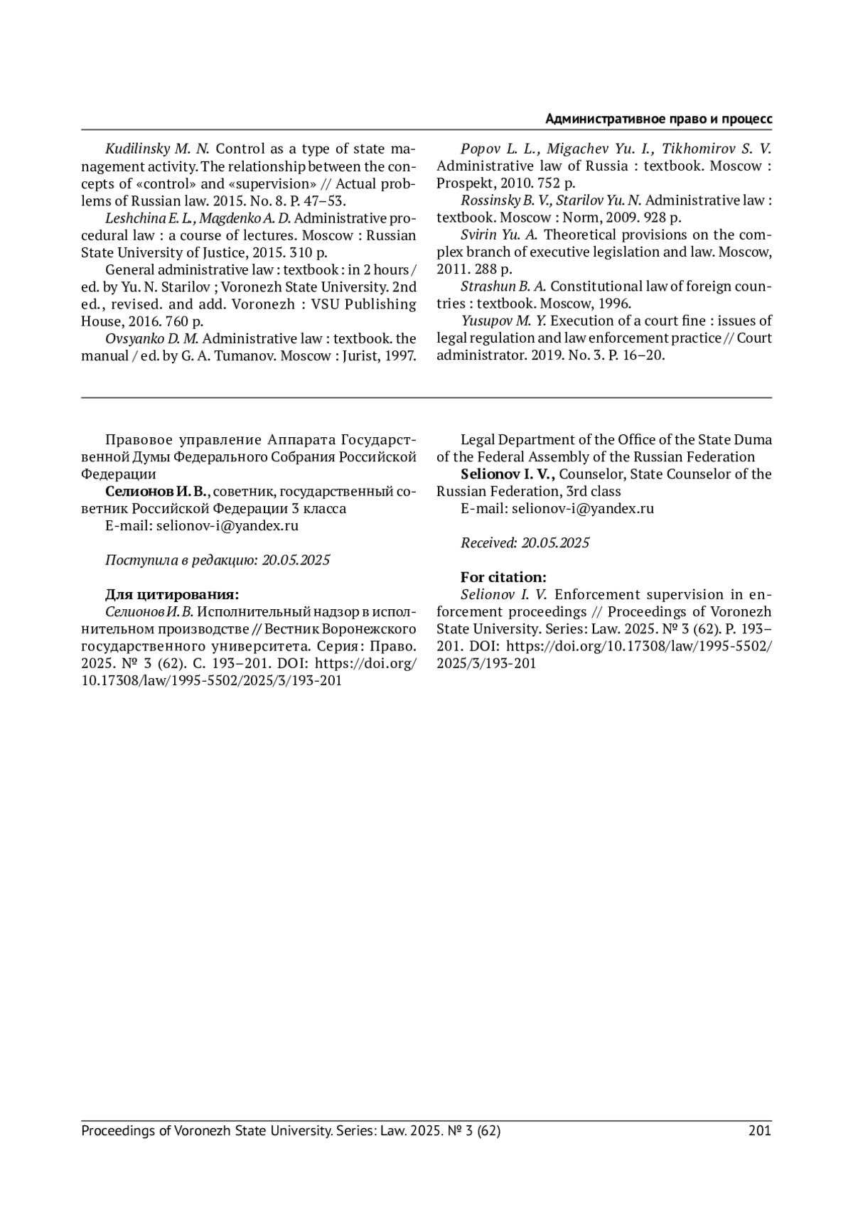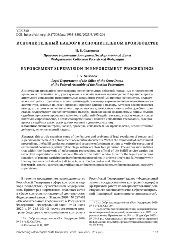 СЕЛИОНОВ И.В. ИСПОЛНИТЕЛЬНЫЙ НАДЗОР В ИСПОЛНИТЕЛЬНОМ ПРОИЗВОДСТВЕ // ВЕСТНИК ВОРОНЕЖСКОГО ГОСУДАРСТВЕННОГО УНИВЕРСИТЕТА. СЕРИЯ: ПРАВО. 2025. № 3 (62)