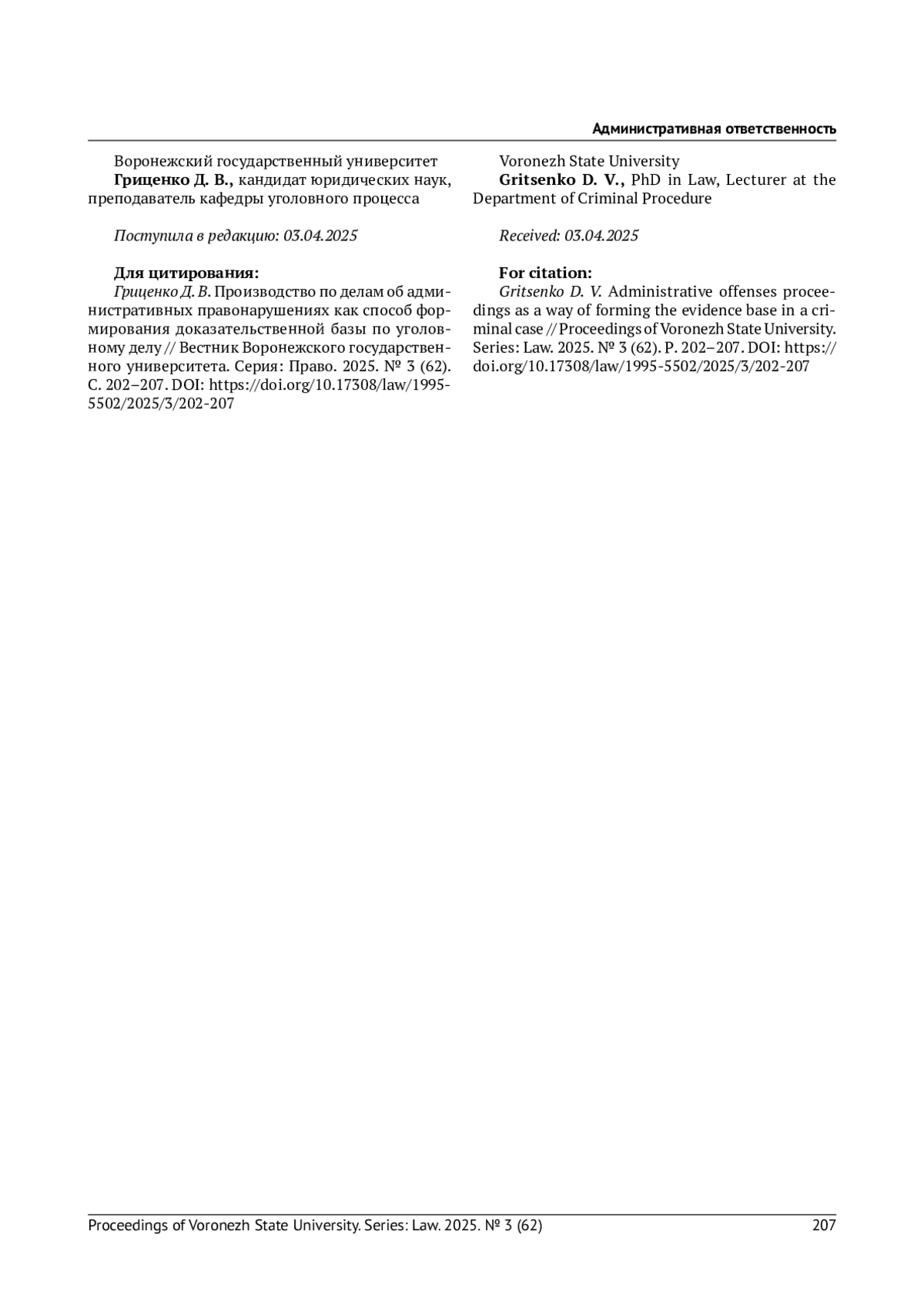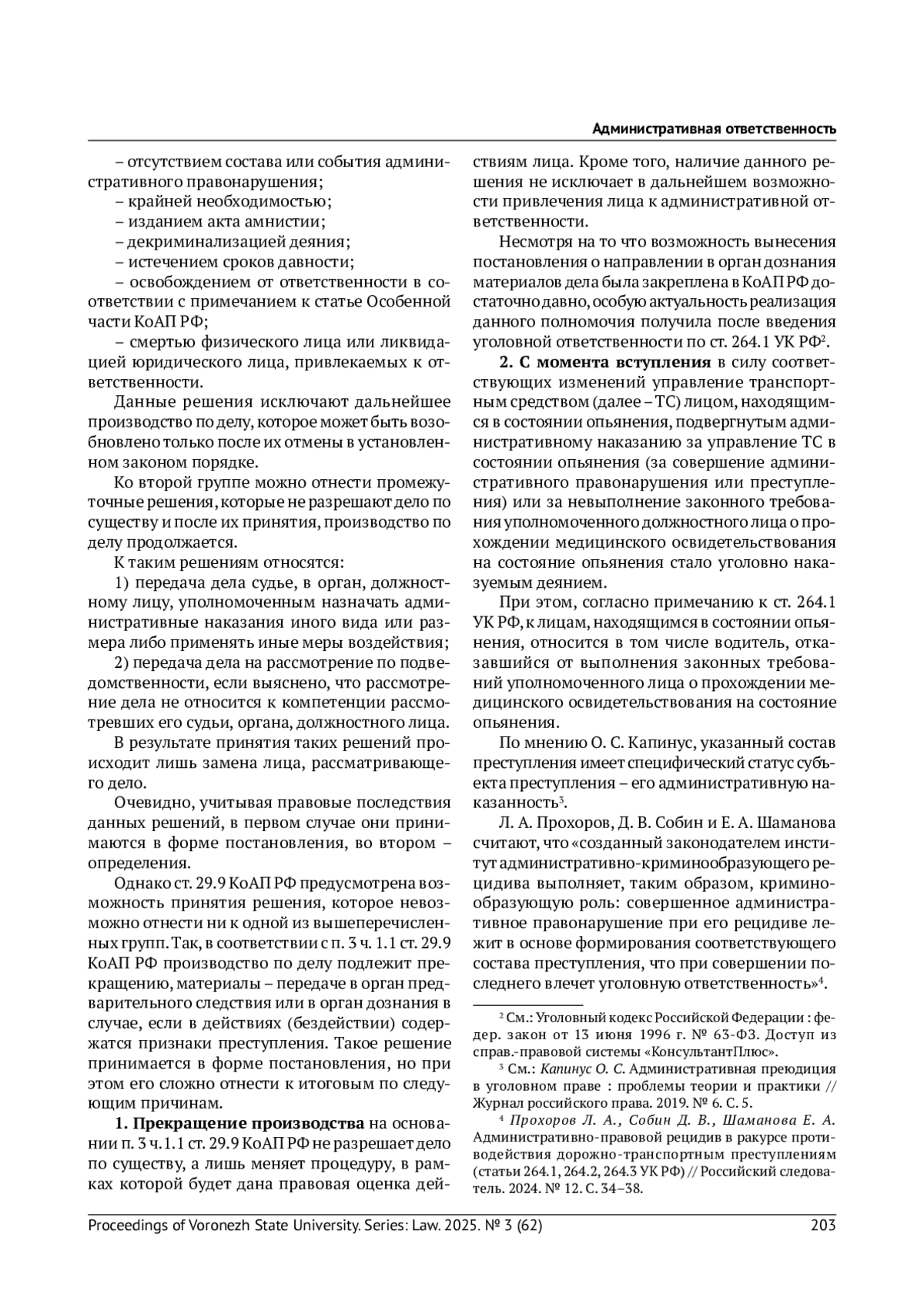 6. Прохоров Л. А., Собин Д. В., Шаманова Е. А. Административно-правовой рецидив в ракурсе противодействия дорожно-транспортным преступлениям (статьи 264.1, 264.2, 264.3 УК РФ) // Российский следователь. 2024. № 12. С. 34-38. EDN: BPBKCI