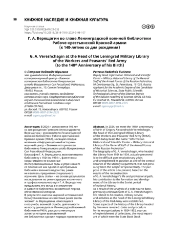 В результате анализа широкой источниковой базы установлены неизвестные ранее факты жизни Г. А. Верещагина, относящиеся к его учебе, военной службе, деятельности на посту руководителя Ленинградской военной библиотеки РККА, раскрыты некоторые аспекты истории возглавляемой им библиотеки: сроки и порядок проведения ее реорганизаций в 1924–1932 гг., источники пополнения фонда, важнейшими из которых стали Государственный книжный фонд и обязательный экземпляр военной литературы, поступавший в библиотеку в 1925–1930 гг.