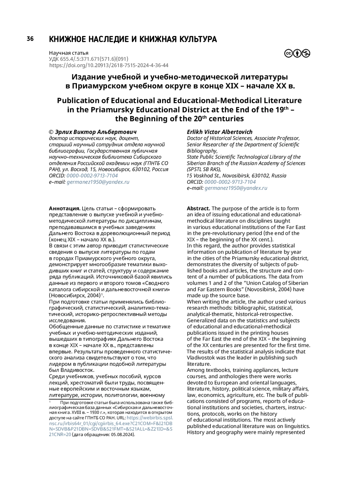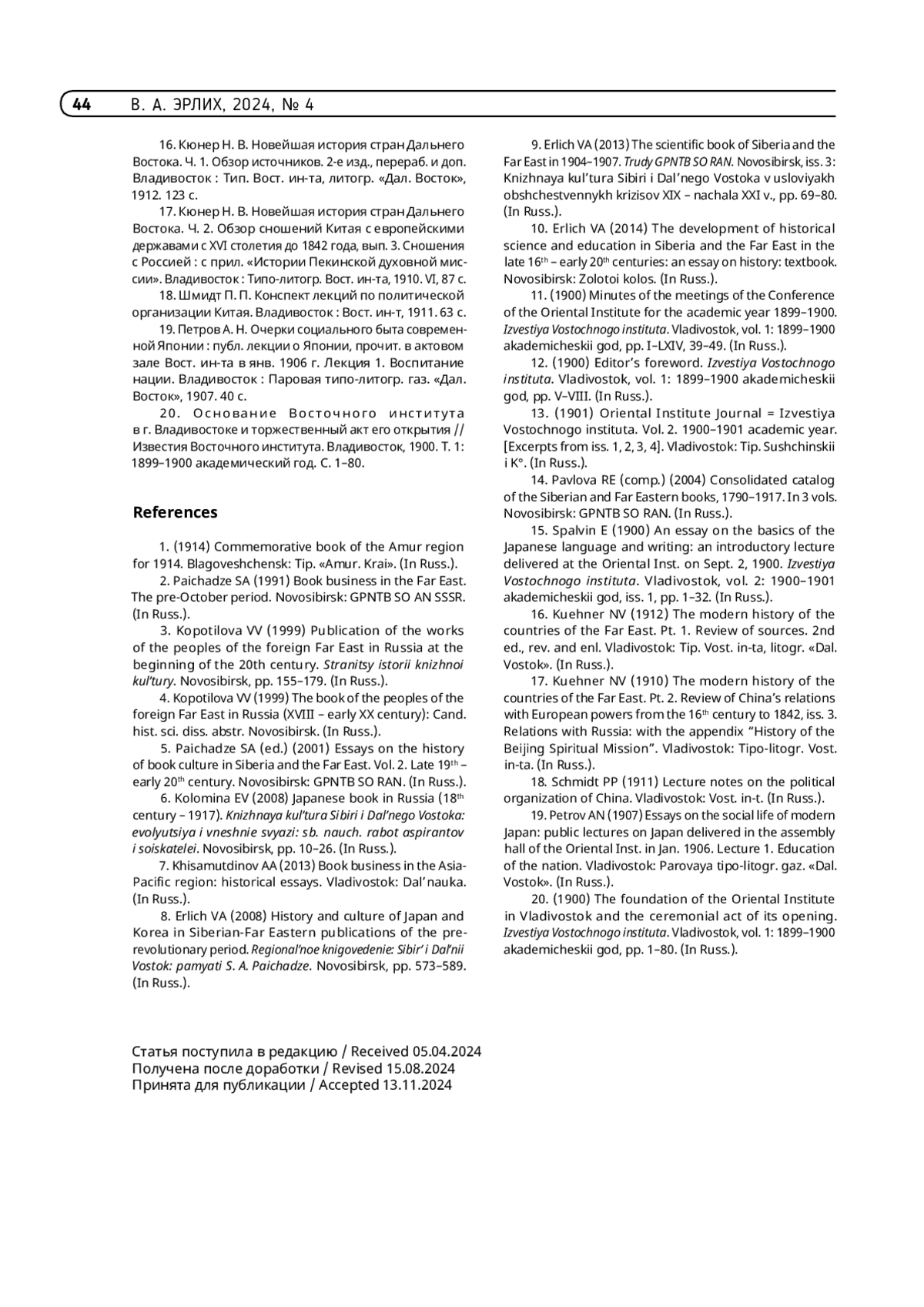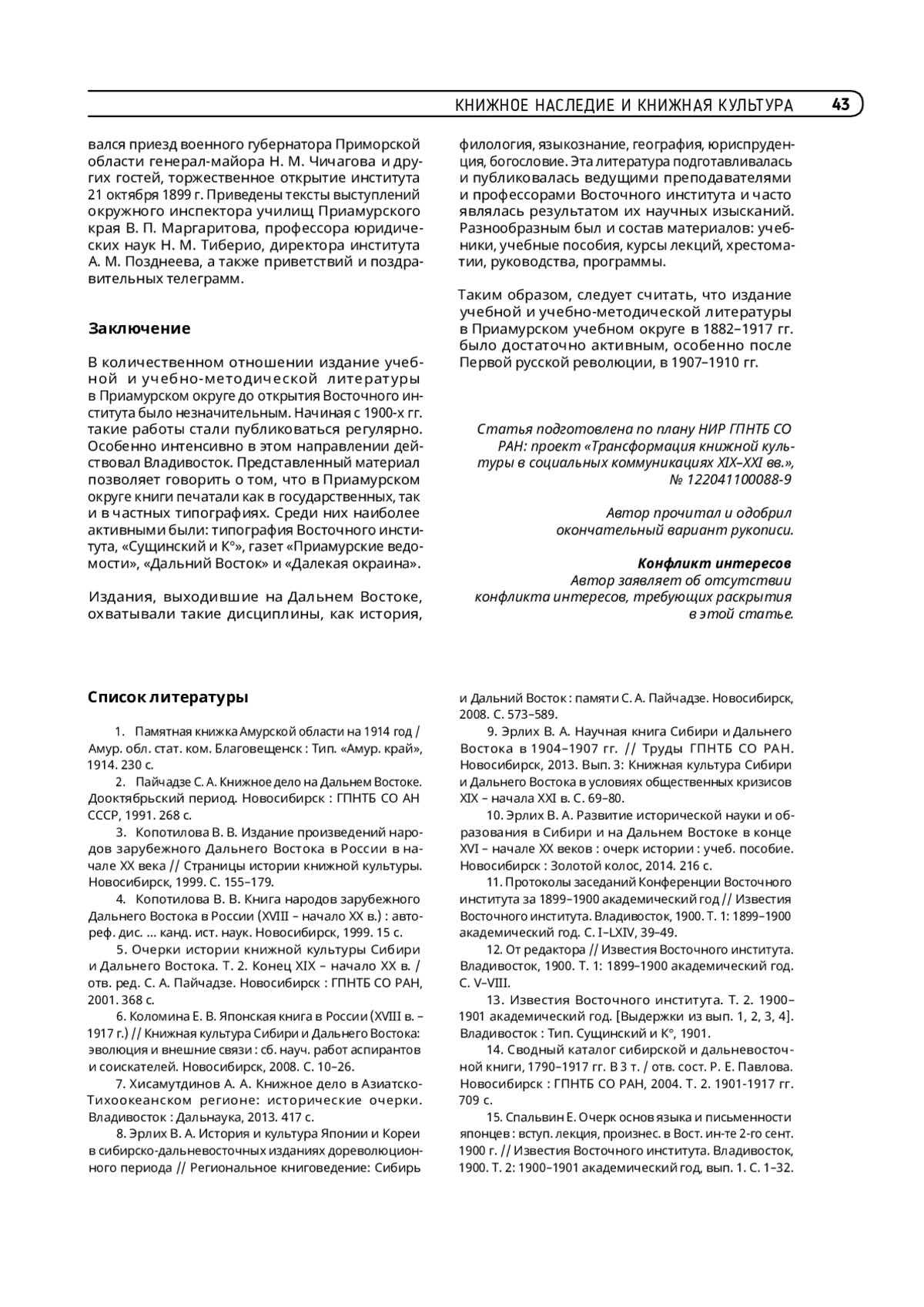 8. Эрлих В.А. Научная книга Сибири и Дальнего Востока в 1904-1907 гг. // Труды ГПНТБ СО РАН. Новосибирск : ГПНТБ СО РАН, 2013. Вып. 3. Книжная культура Сибири и Дальнего Востока в условиях общественных кризисов XIX - начала XXI в. - С. 69-80.