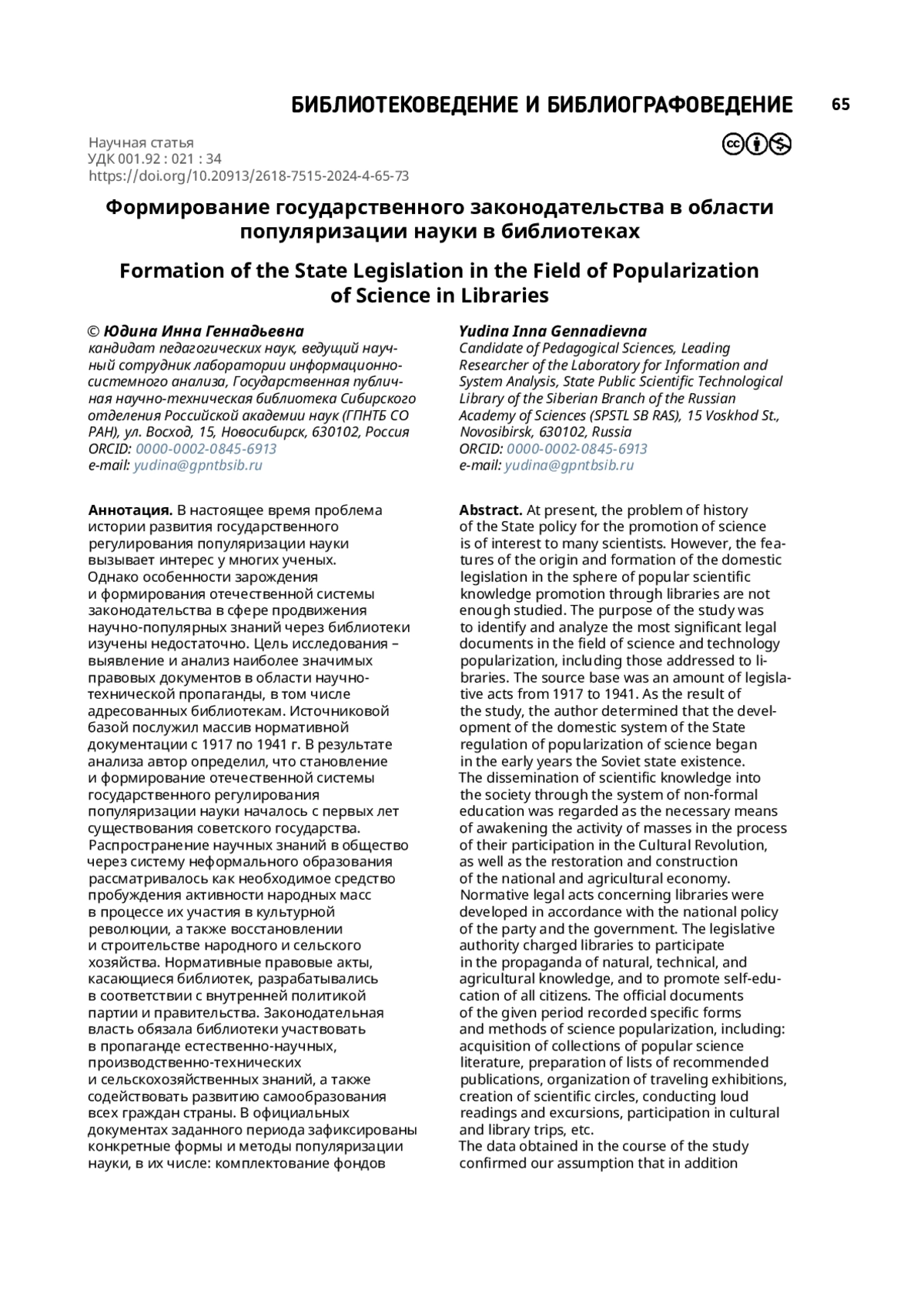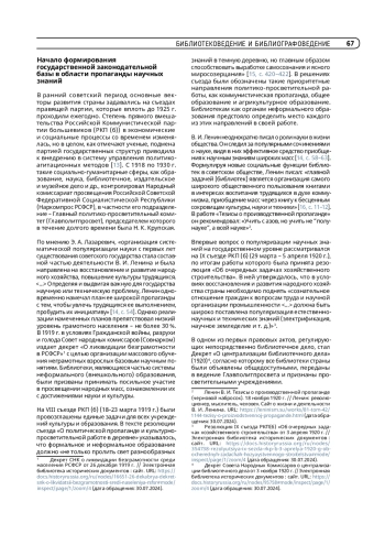 В настоящее время проблема истории развития государственного регулирования популяризации науки вызывает интерес у многих ученых. Однако особенности зарождения и формирования отечественной системы законодательства в сфере продвижения научно-популярных знаний через библиотеки изучены недостаточно. Цель исследования – выявление и анализ наиболее значимых правовых документов в области научно-технической пропаганды, в том числе адресованных библиотекам. Источниковой базой послужил массив нормативной документации с 1917 по 1941 г. В результате анализа автор определил, что становление и формирование отечественной системы государственного регулирования популяризации науки началось с первых лет существования советского государства. Распространение научных знаний в общество через систему неформального образования рассматривалось как необходимое средство пробуждения активности народных масс в процессе их участия в культурной революции, а также восстановлении и строительстве народного и сельского хозяйства. Нормативные правовые акты, касающиеся библиотек, разрабатывались в соответствии с внутренней политикой партии и правительства. Законодательная власть обязала библиотеки участвовать в пропаганде естественно-научных, производственно-технических и сельскохозяйственных знаний, а также содействовать развитию самообразования всех граждан страны. В официальных документах заданного периода зафиксированы конкретные формы и методы популяризации науки, в их числе: комплектование фондов научно-популярной литературы, подготовка списков рекомендованных изданий, организация передвижных выставок, создание научных кружков, проведение громких чтений, экскурсий, участие в культурных и библиотечных походах и т. д. Полученные в ходе исследования данные подтвердили наше предположение о том, что в СССР на библиотечное дело, помимо обслуживания идеологического заказа государства, уже в ранний советский период законодательно были возложены функции популяризации общенаучных знаний.