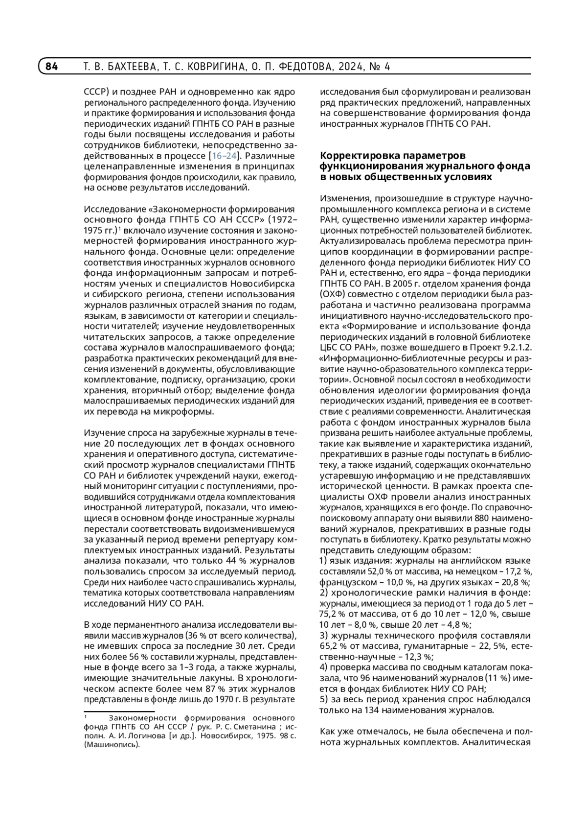 22. Федотова О. П., Каратаева Г. И., Ковригина Т. С. Изучение динамики формирования и использования фонда журналов основного хранения ГПНТБ СО РАН // Труды ГПНТБ СО РАН. Новосибирск, 2011. Вып. 1: Развитие электронной информационно-библиотечной среды. С. 66-76.