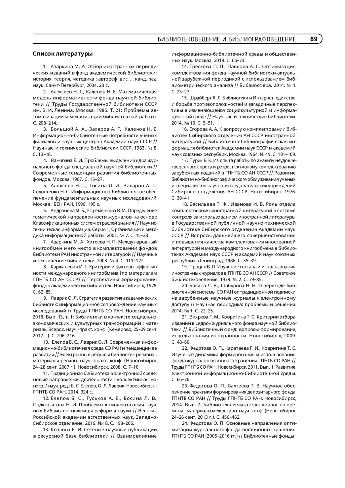 12. Елепов Б. С., Гуськов А. Е., Босина Л. В., Подкорытова Н. И. Проблемы комплектования научных библиотек: ножницы реформы науки // Вестник Российской академии естественных наук. Западно-Сибирское отделение. 2016. №18. С. 198-205.