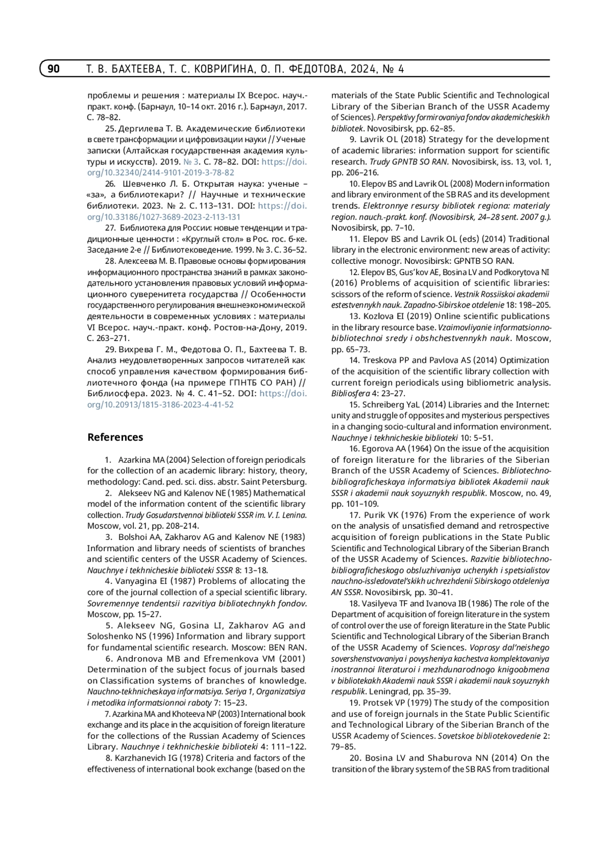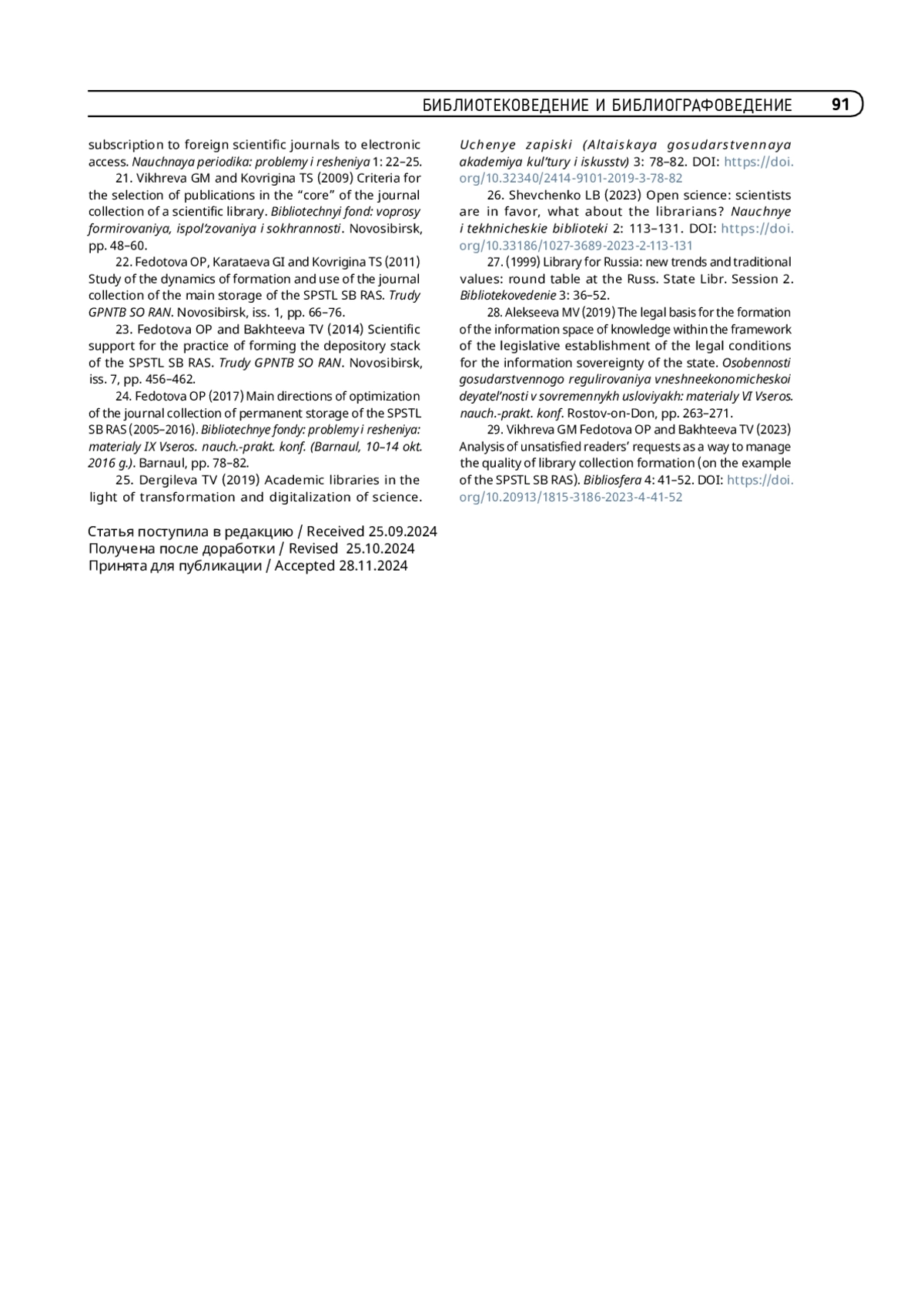 29. Вихрева Г. М., Федотова О. П., Бахтеева Т. В. Анализ неудовлетворенных запросов читателей как способ управления качеством формирования библиотечного фонда (на примере ГПНТБ СО РАН) // Библиосфера. 2023. № 4. С. 41-52. https://doi.org/10.20913/1815-3186-2023-4-41-52