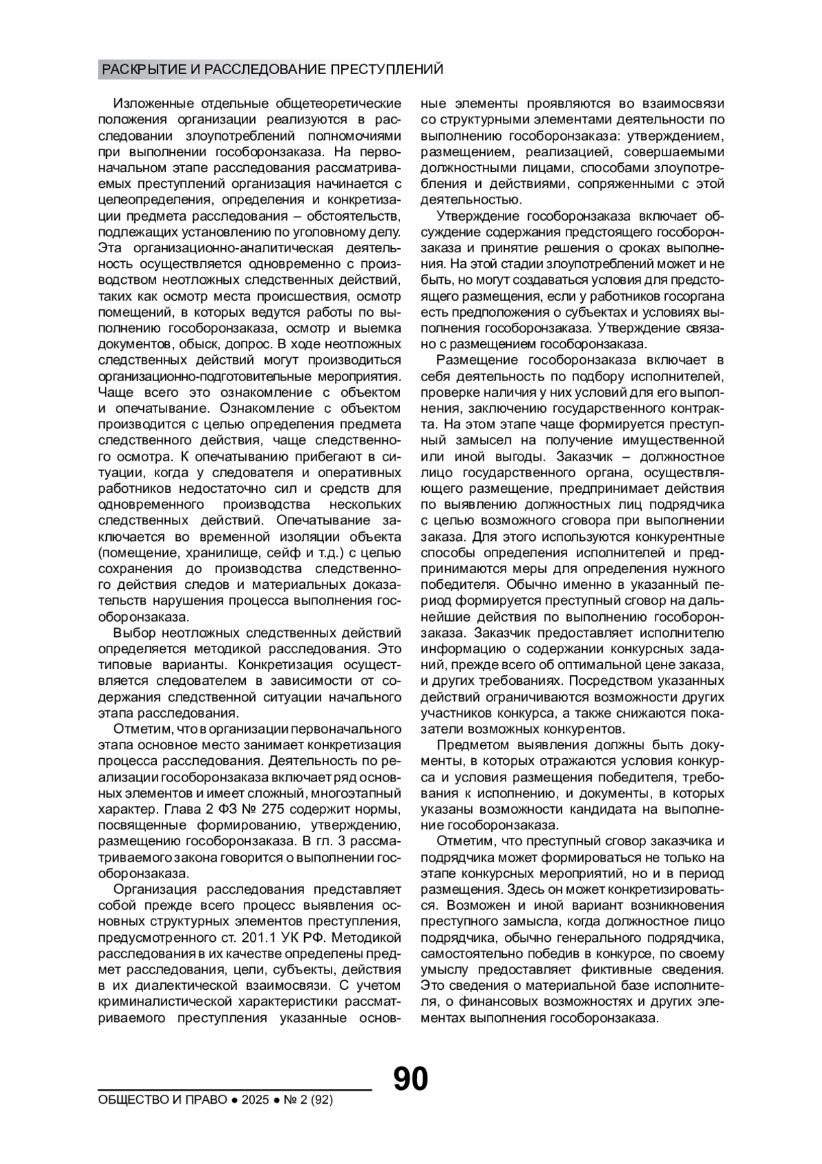 КАЛИОРОПУЛО А. Е. ОРГАНИЗАЦИЯ ПЕРВОНАЧАЛЬНОГО ЭТАПА РАССЛЕДОВАНИЯ ЗЛОУПОТРЕБЛЕНИЯ ПОЛНОМОЧИЯМИ ПРИ ВЫПОЛНЕНИИ ГОСУДАРСТВЕННОГО ОБОРОННОГО ЗАКАЗА // ОБЩЕСТВО И ПРАВО. 2025. № 2 (92)