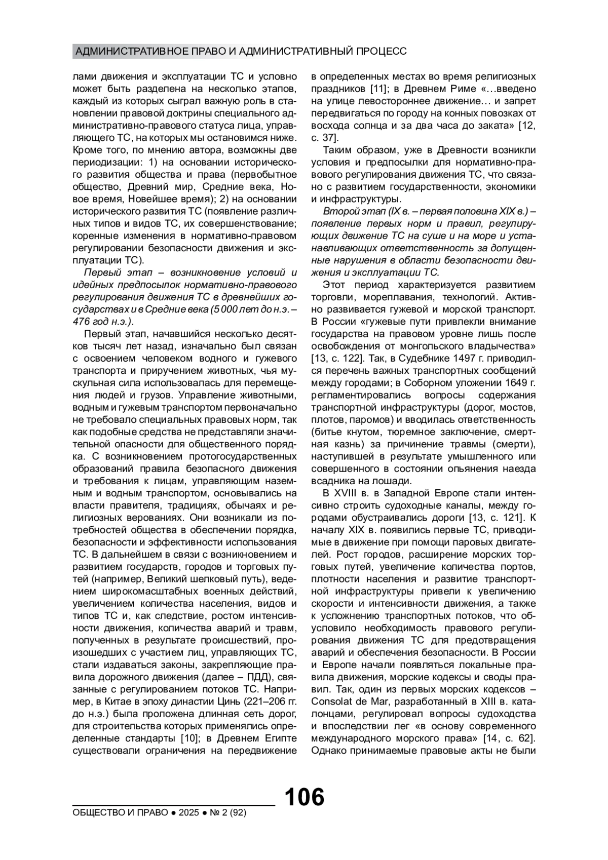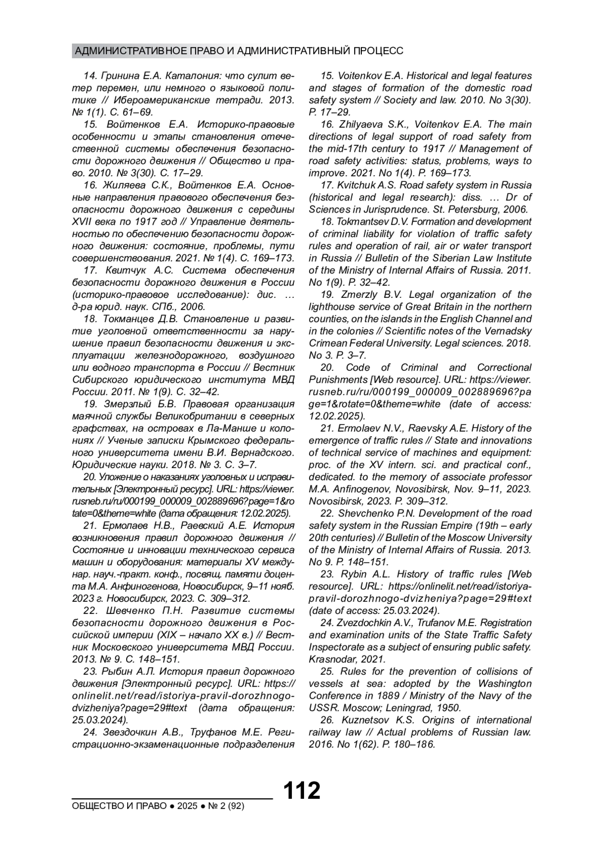15. Войтенков Е.А. Историко-правовые особенности и этапы становления отечественной системы обеспечения безопасности дорожного движения // Общество и право. 2010. № 3(30). С. 17-29. EDN: NDBGYR
