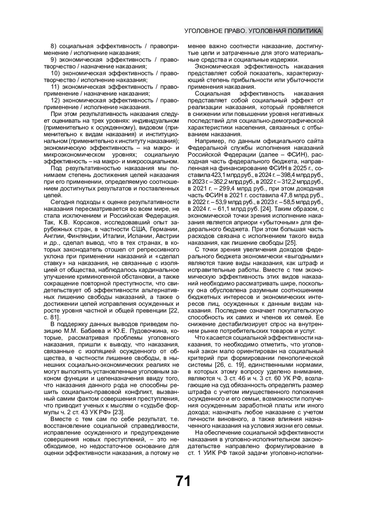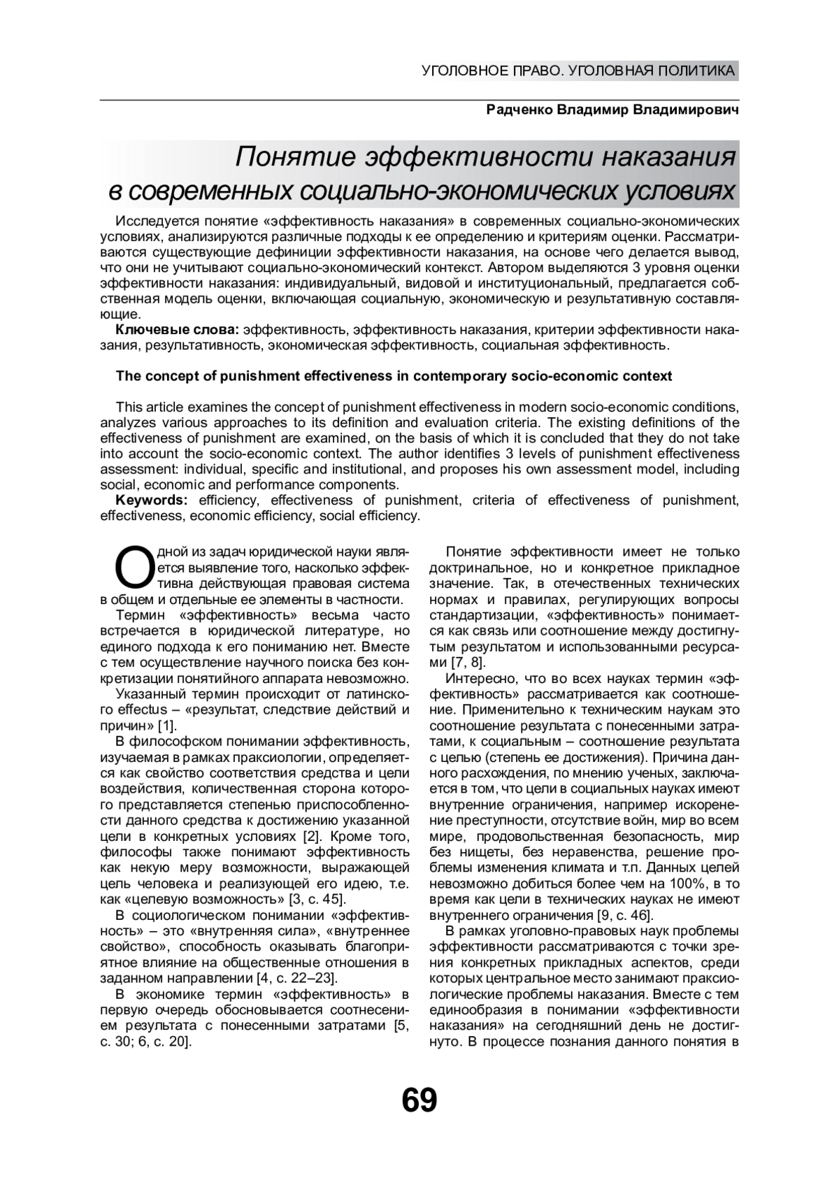 Исследуется понятие «эффективность наказания» в современных социально-экономических условиях, анализируются различные подходы к ее определению и критериям оценки. Рассматриваются существующие дефиниции эффективности наказания, на основе чего делается вывод, что они не учитывают социально-экономический контекст. Автором выделяются 3 уровня оценки эффективности наказания: индивидуальный, видовой и институциональный, предлагается собственная модель оценки, включающая социальную, экономическую и результативную составляющие
