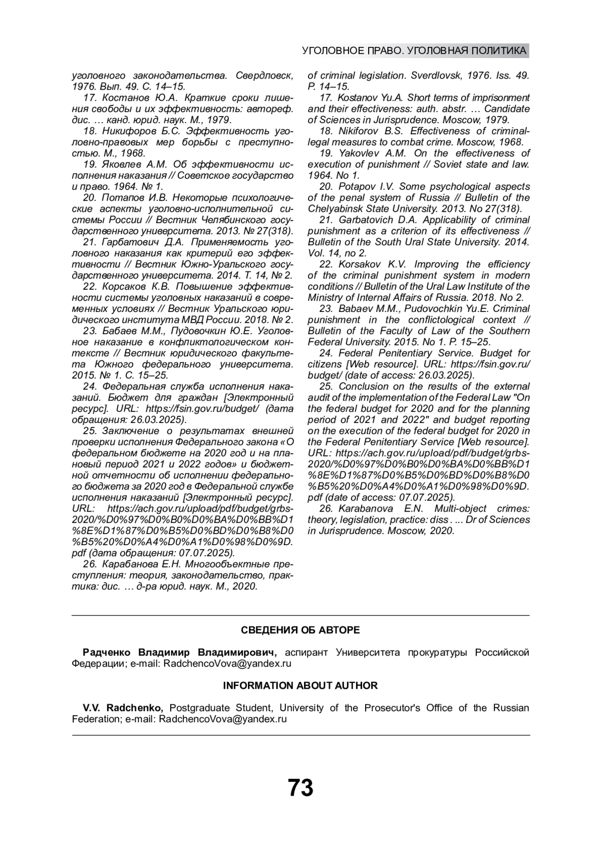 21. Гарбатович Д.А. Применяемость уголовного наказания как критерий его эффективности // Вестник Южно-Уральского государственного университета. Серия: Право. - 2014. - Т. 14. - № 2. - С. 32-38. EDN: SGMQUH
