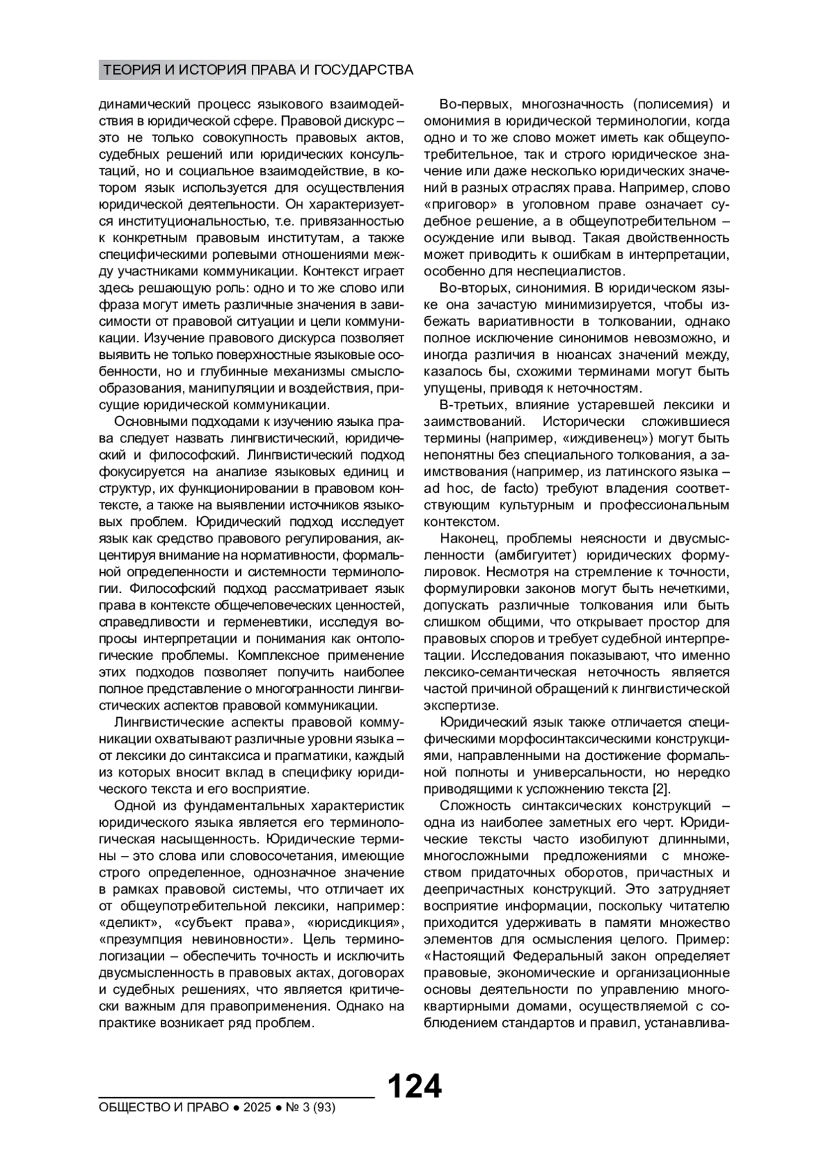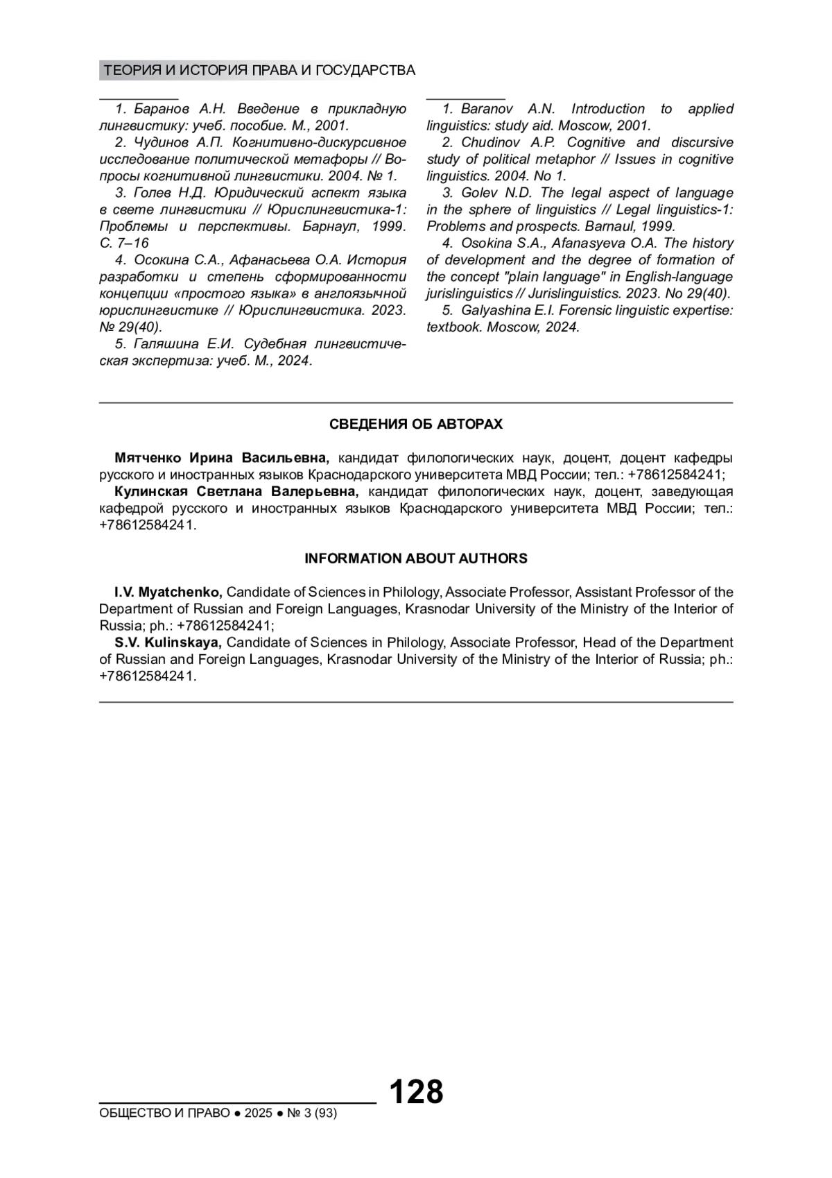 МЯТЧЕНКО И. В., КУЛИНСКАЯ С. В. ЛИНГВИСТИЧЕСКИЕ АСПЕКТЫ ПРАВОВОЙ КОММУНИКАЦИИ // ОБЩЕСТВО И ПРАВО. 2025. № 3 (93)