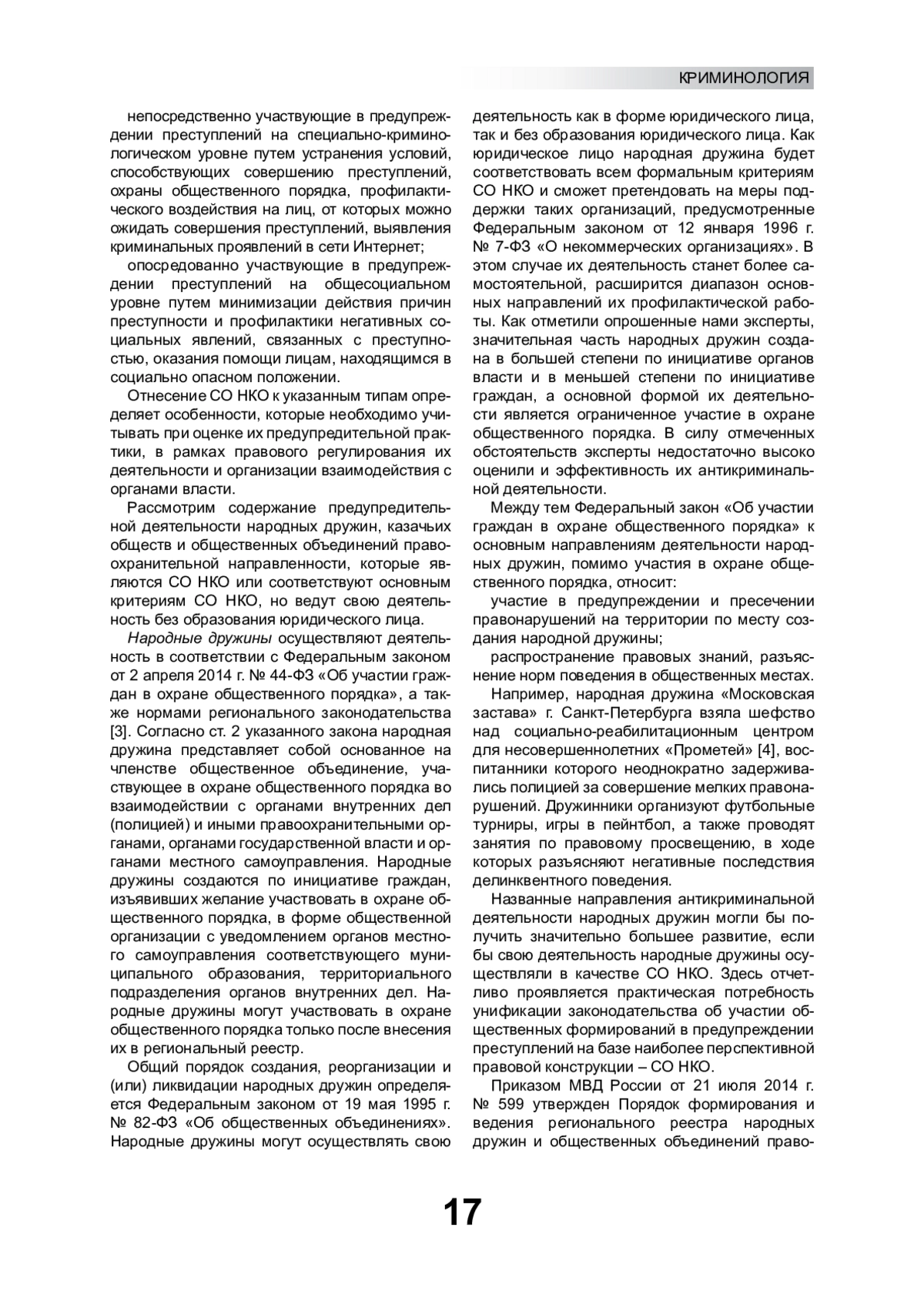 Анализируются вопросы организации участия граждан в обеспечении общественного порядка, формулируются предложения по совершенствованию исследуемого вида деятельности