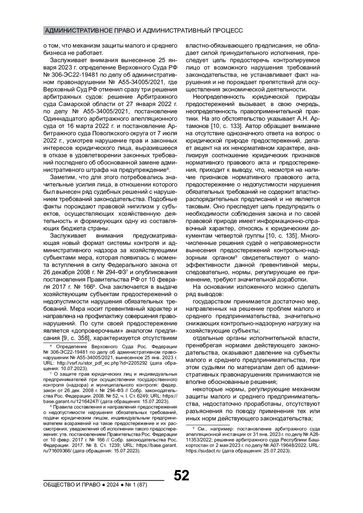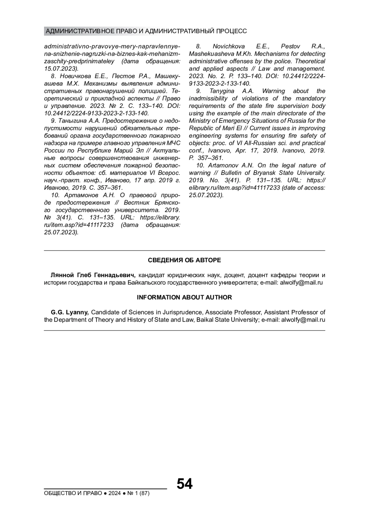 10. Артамонов А.Н. О правовой природе предостережения // Вестник Брянского государственного университета. 2019. № 3(41). С. 131-135. URL: item.asp?id=41117233 (дата обращения: 25.07.2023). EDN: ECGRNI