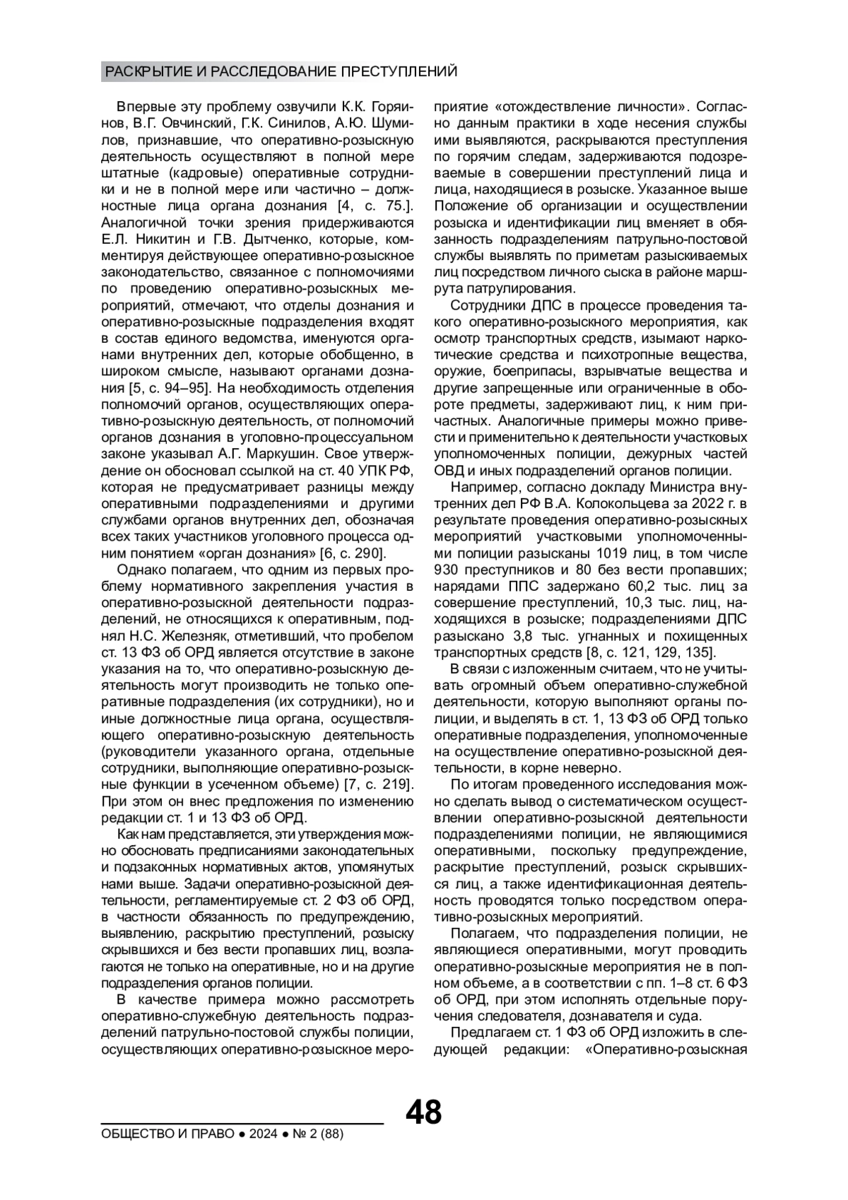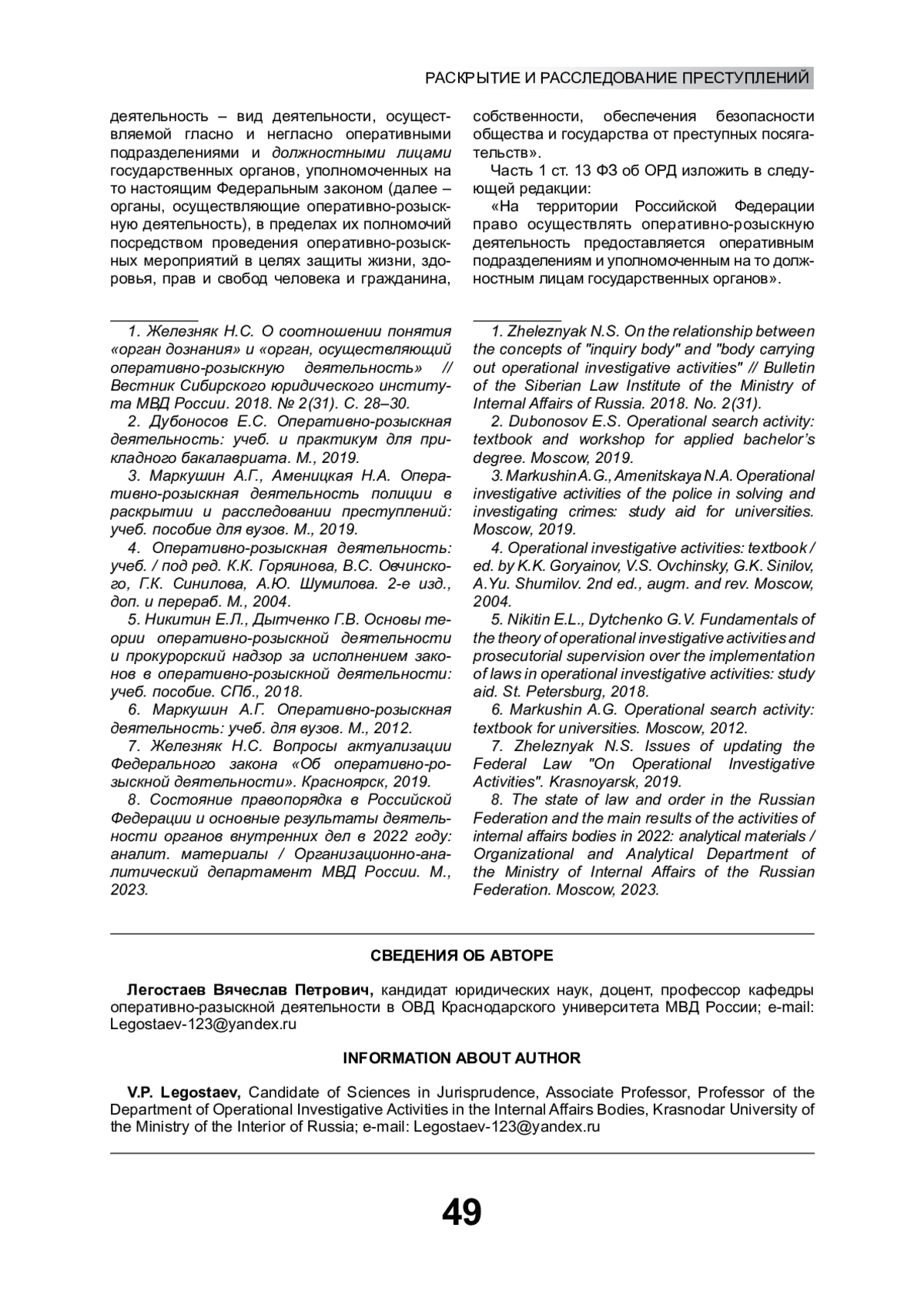ЛЕГОСТАЕВ В. П. ПРОБЛЕМЫ ЗАКОНОДАТЕЛЬНОГО РЕГУЛИРОВАНИЯ ОСУЩЕСТВЛЕНИЯ ОРГАНАМИ ПОЛИЦИИ ОПЕРАТИВНО-РОЗЫСКНОЙ ДЕЯТЕЛЬНОСТИ // ОБЩЕСТВО И ПРАВО. 2024. № 2 (88)