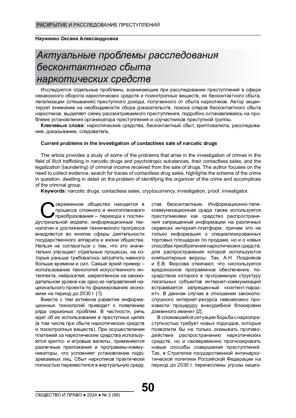 НАУМЕНКО О. А. АКТУАЛЬНЫЕ ПРОБЛЕМЫ РАССЛЕДОВАНИЯ БЕСКОНТАКТНОГО СБЫТА НАРКОТИЧЕСКИХ СРЕДСТВ // ОБЩЕСТВО И ПРАВО. 2024. № 2 (88)
