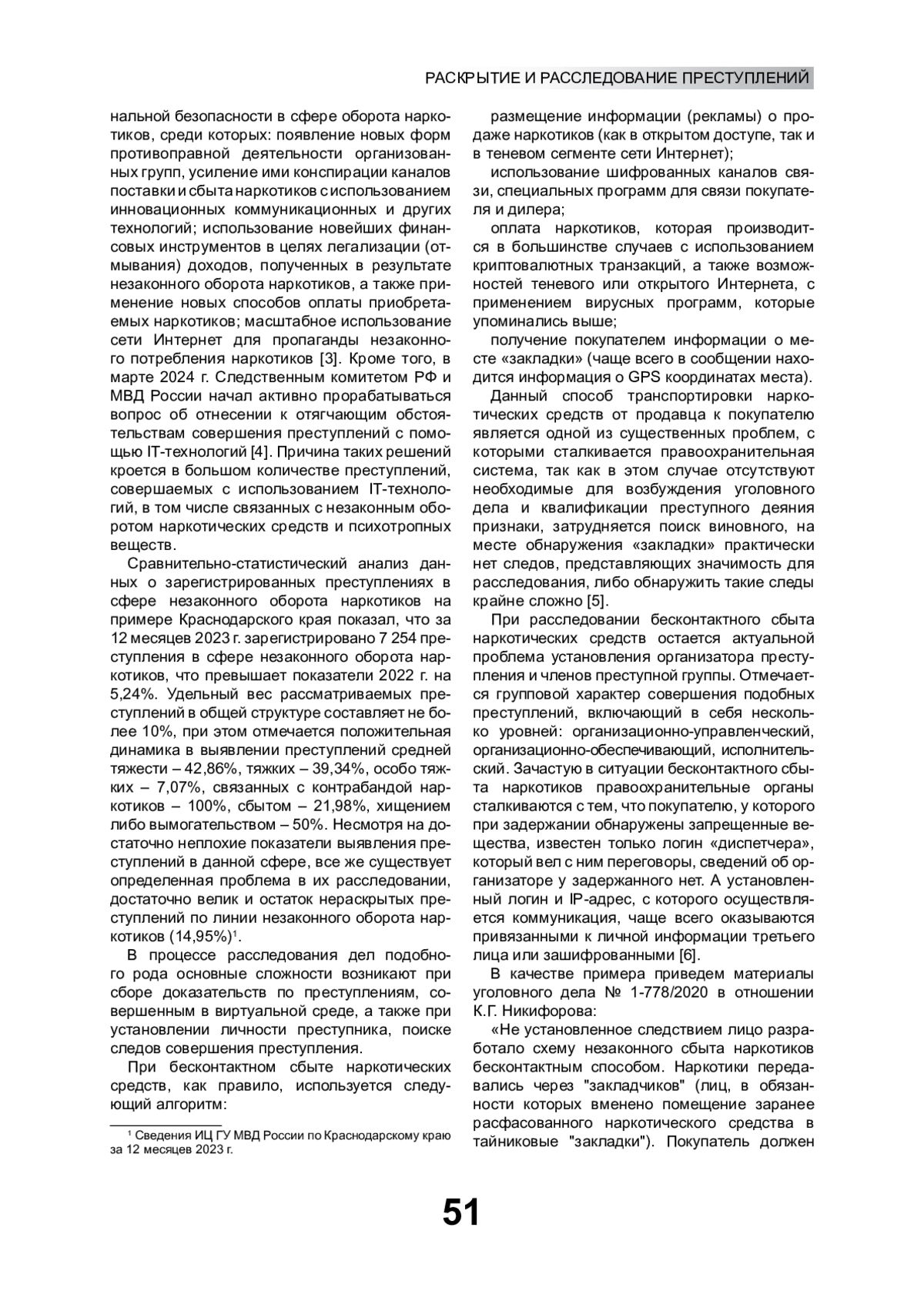 Статья: АКТУАЛЬНЫЕ ПРОБЛЕМЫ РАССЛЕДОВАНИЯ БЕСКОНТАКТНОГО СБЫТА НАРКОТИЧЕСКИХ СРЕДСТВ (2024)