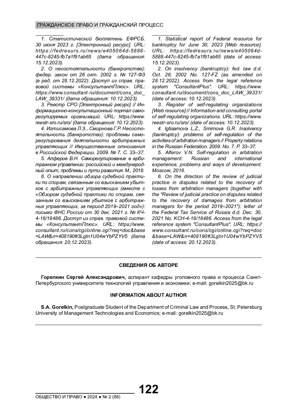 ГОРЕЛКИН С. А. СОВЕРШЕНСТВОВАНИЕ ОЦЕНКИ ДЕЯТЕЛЬНОСТИ САМОРЕГУЛИРУЕМЫХ ОРГАНИЗАЦИЙ АРБИТРАЖНЫХ УПРАВЛЯЮЩИХ // ОБЩЕСТВО И ПРАВО. 2024. № 2 (88)