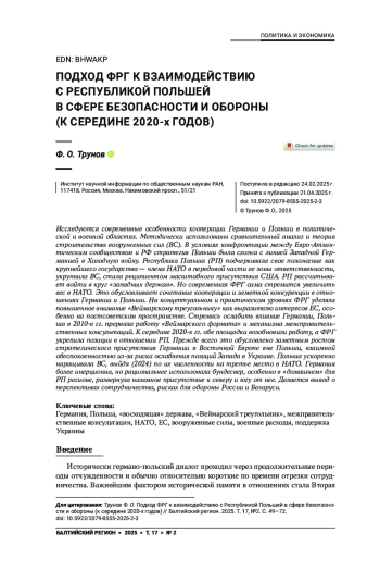 Исследуются современные особенности кооперации Германии и Польши в политической и военной областях. Методически использованы сравнительный анализ и теория строительства вооруженных сил (ВС). В условиях конфронтации между Евро-Атлантическим сообществом и РФ стратегия Польши была схожа с линией Западной Германией в Холодную войну. Республика Польша (РП) подчеркивала свое положение как крупнейшего государства — члена НАТО в передовой части ее зоны ответственности, укрупнила ВС, стала реципиентом масштабного присутствия США. РП рассчитывает войти в круг «западных держав». Но современная ФРГ сама стремится увеличить вес в НАТО. Это обусловливает сочетание кооперации и заметной конкуренции в отношениях Германии и Польши. На концептуальном и практическом уровнях ФРГ уделяла повышенное внимание «Веймарскому треугольнику» как выразителю интересов ЕС, особенно на постсоветском пространстве. Стремясь ослабить влияние Германии, Польша в 2010- е гг. прервала работу «Веймарского формата» и механизма межправительственных консультаций. К середине 2020-х гг. обе площадки возобновили работу, а ФРГ укрепила позиции в отношении РП. Прежде всего это обусловлено заметным ростом стратегического присутствия Германии в Восточной Европе вне Польши, взаимной обеспокоенностью из-за риска ослабления позиций Запада в Украине. Польша ускоренно наращивала ВС, выйдя (2024) по их численности на третье место в НАТО. Германия более инерционна, но рациональнее использовала бундесвер, особенно в «домашнем» для РП регионе, развернула наземное присутствие к северу и югу от нее. Делается вывод о перспективах сотрудничества, рисках для обороны России и Беларуси.