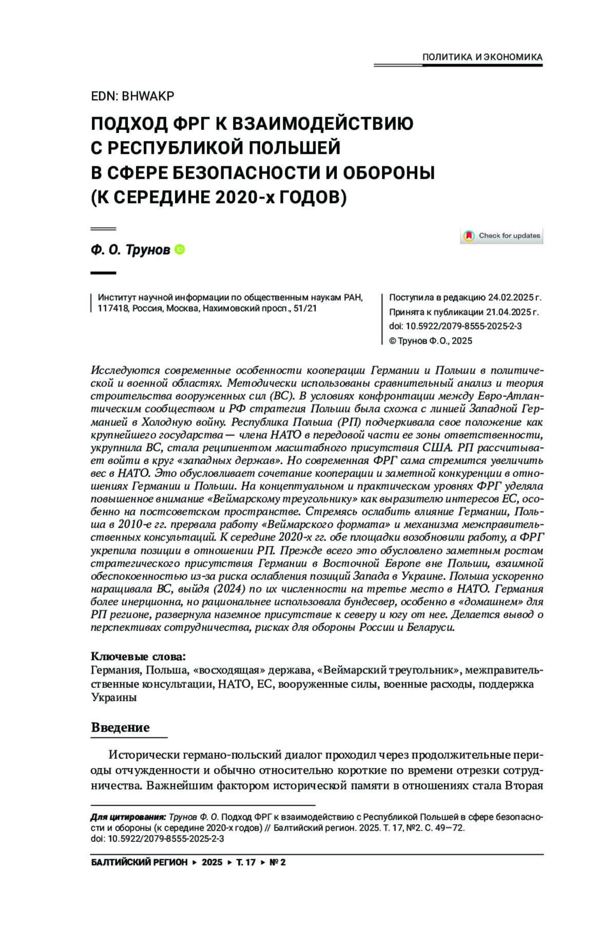 10.Трунов, Ф. О. 2019, Германо-польские отношения на современном этапе: Политико-военное измерение, Актуальные проблемы Европы, № 3, с. 169—190. EDN: JKBWSP, https://doi.org/10.31249/ape/2019.03.08