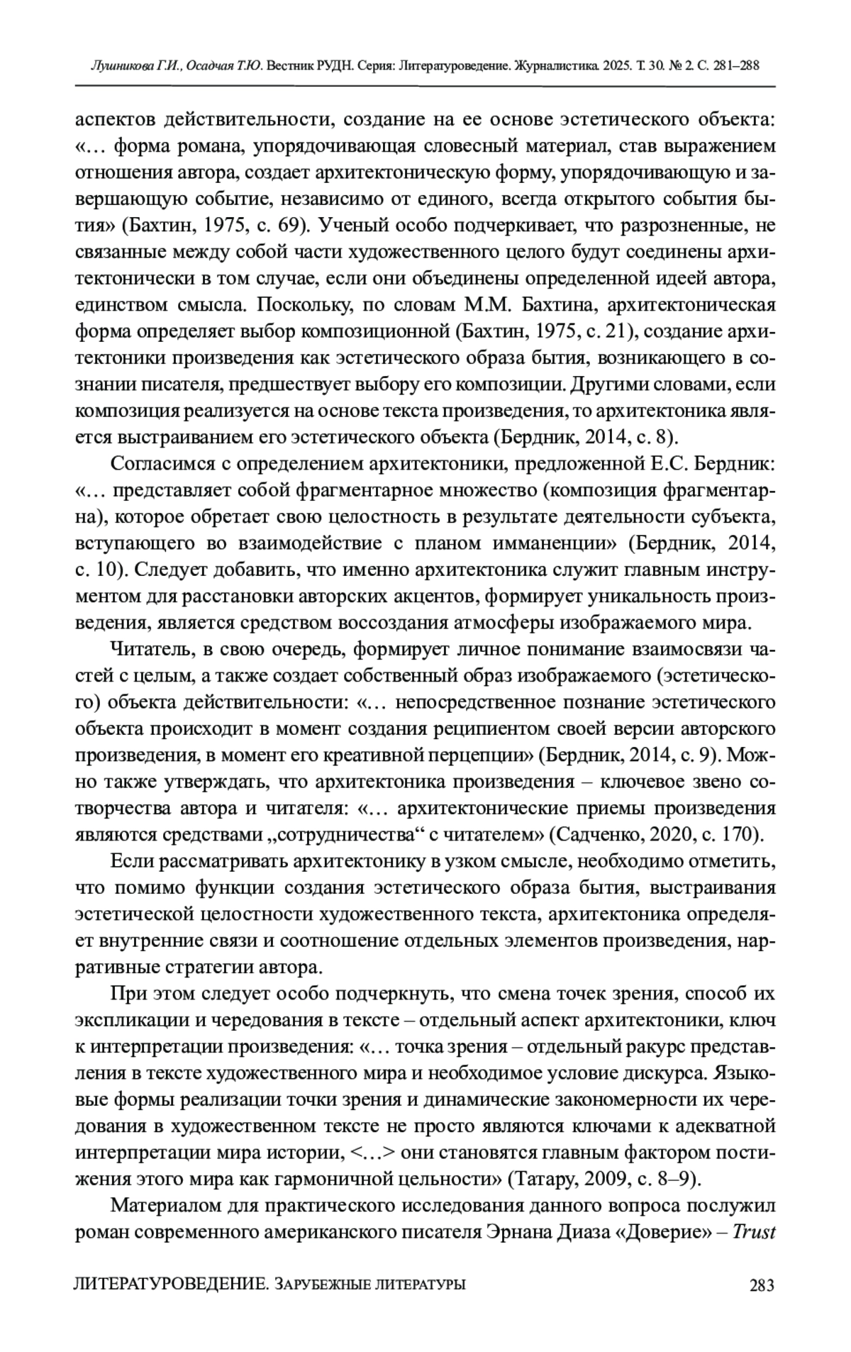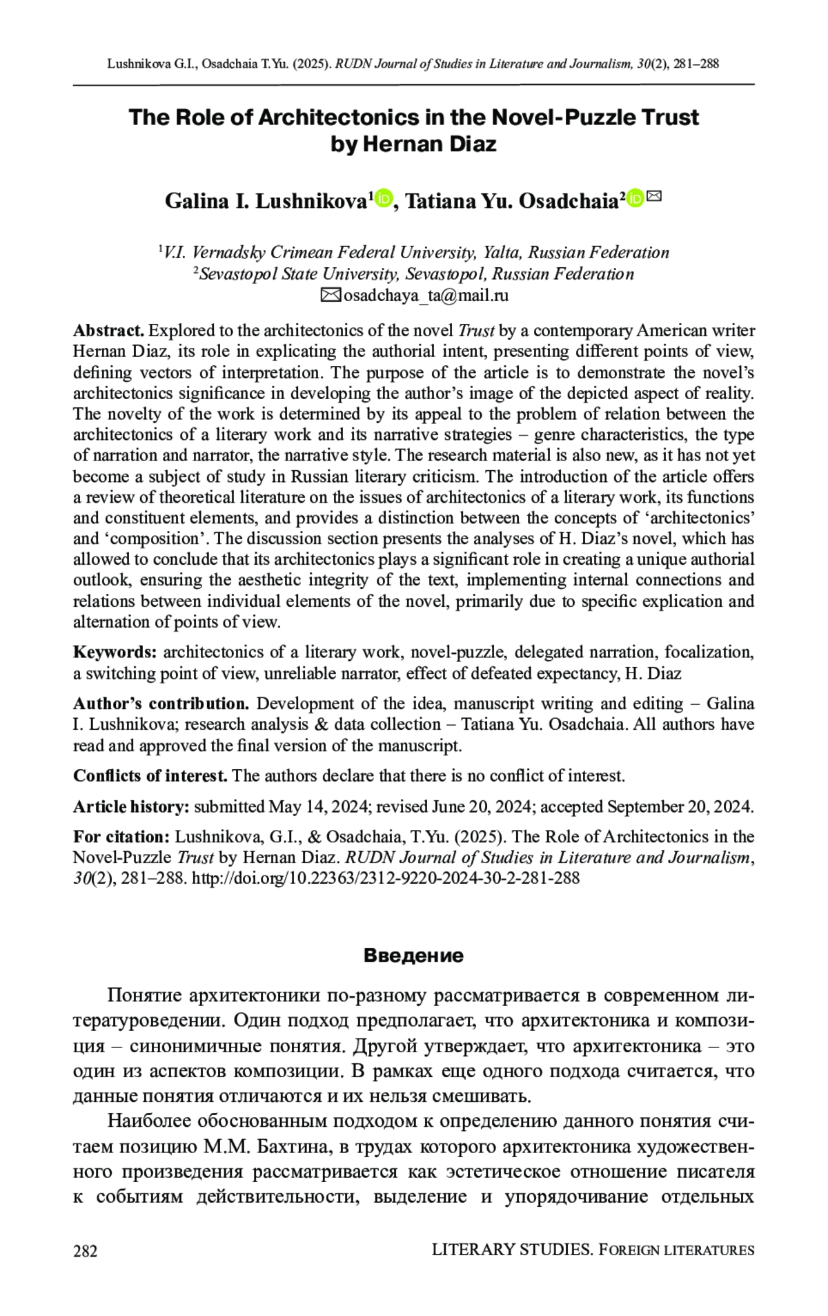 Цель статьи - демонстрация значимости архитектоники данного романа в формировании авторского образа изображаемого объекта действительности. Новизну работы определяет обращение к проблеме соотношения архитектоники художественного произведения и его нарративных тактик - жанровых характеристик, типа повествования и автора-повествователя, стилистики изложения. Новым является и материал исследования. Во введении предлагается теоретический обзор вопросов архитектоники художественного произведения, ее функций и составляющих элементов, дается разграничение понятий «архитектоника» и «композиция». В основном разделе проводится анализ романа Э. Диаза, который позволил заключить, что его архитектоника играет существенную роль в создании уникального авторского образа бытия, обеспечении эстетической целостности текста, реализации внутренних связей и соотношения отдельных элементов романа, в первую очередь за счет специфической экспликации и определенного чередования точек зрения.