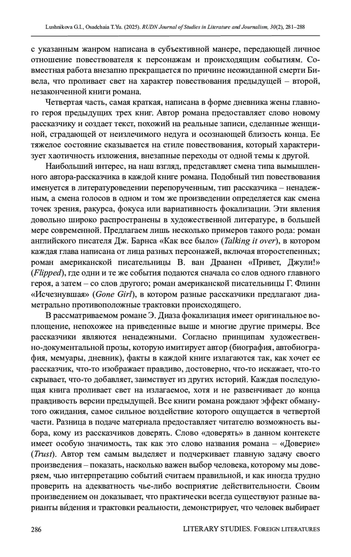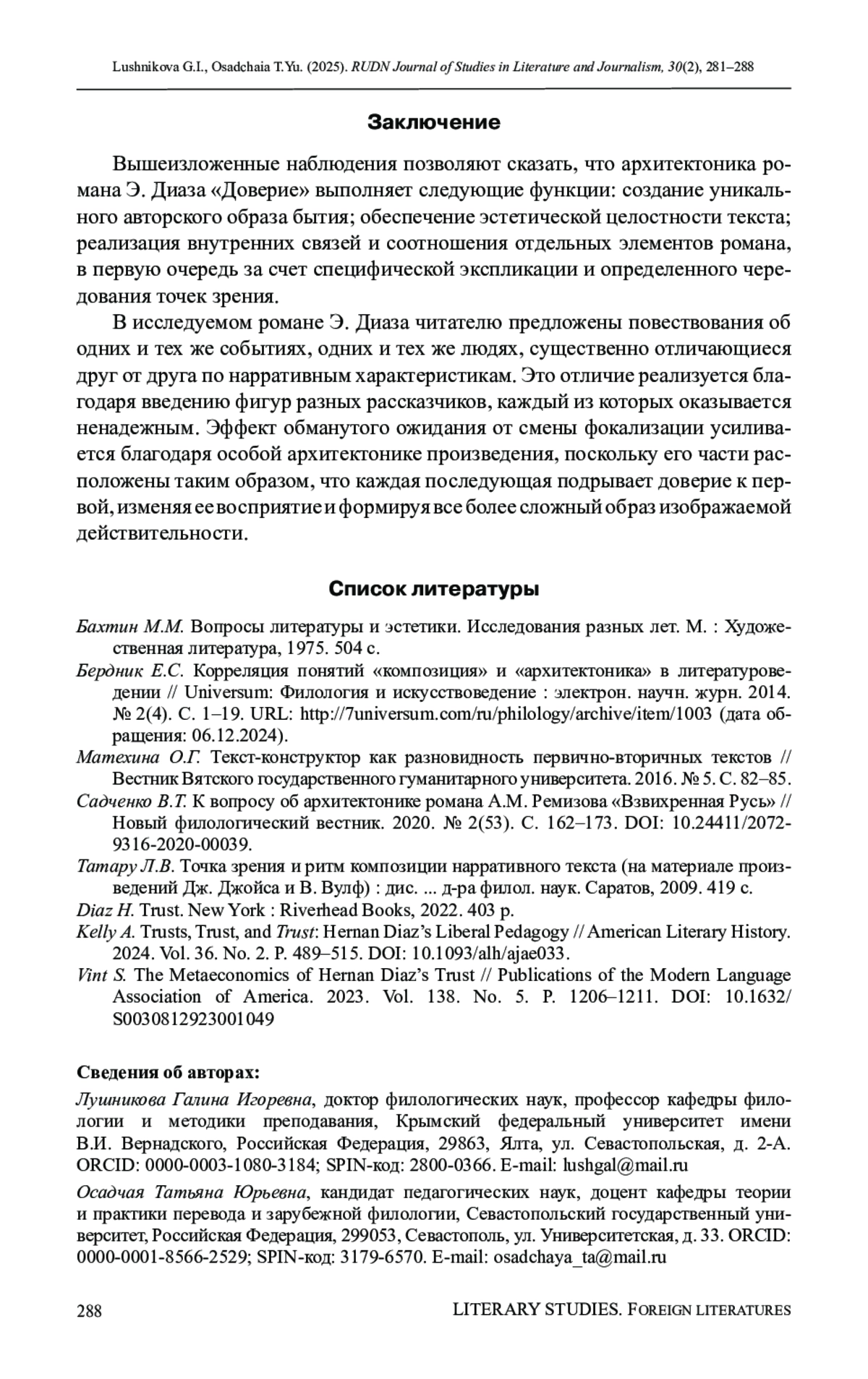 7. Kelly A. Trusts, Trust, and Trust: Hernan Diaz’s Liberal Pedagogy // American Literary History. 2024. Vol. 36. No. 2. P. 489-515. DOI: 10.1093/alh/ajae033 EDN: ZNGADX