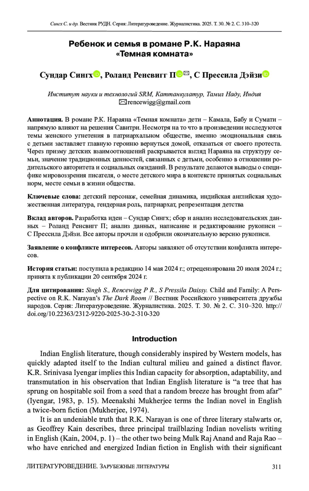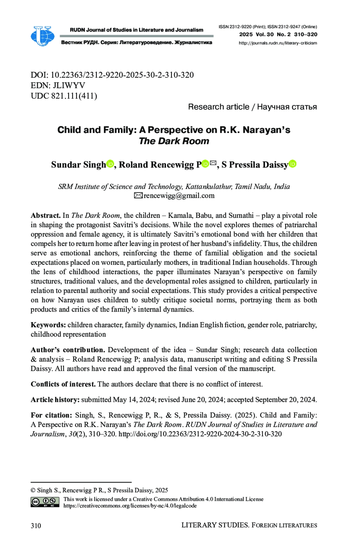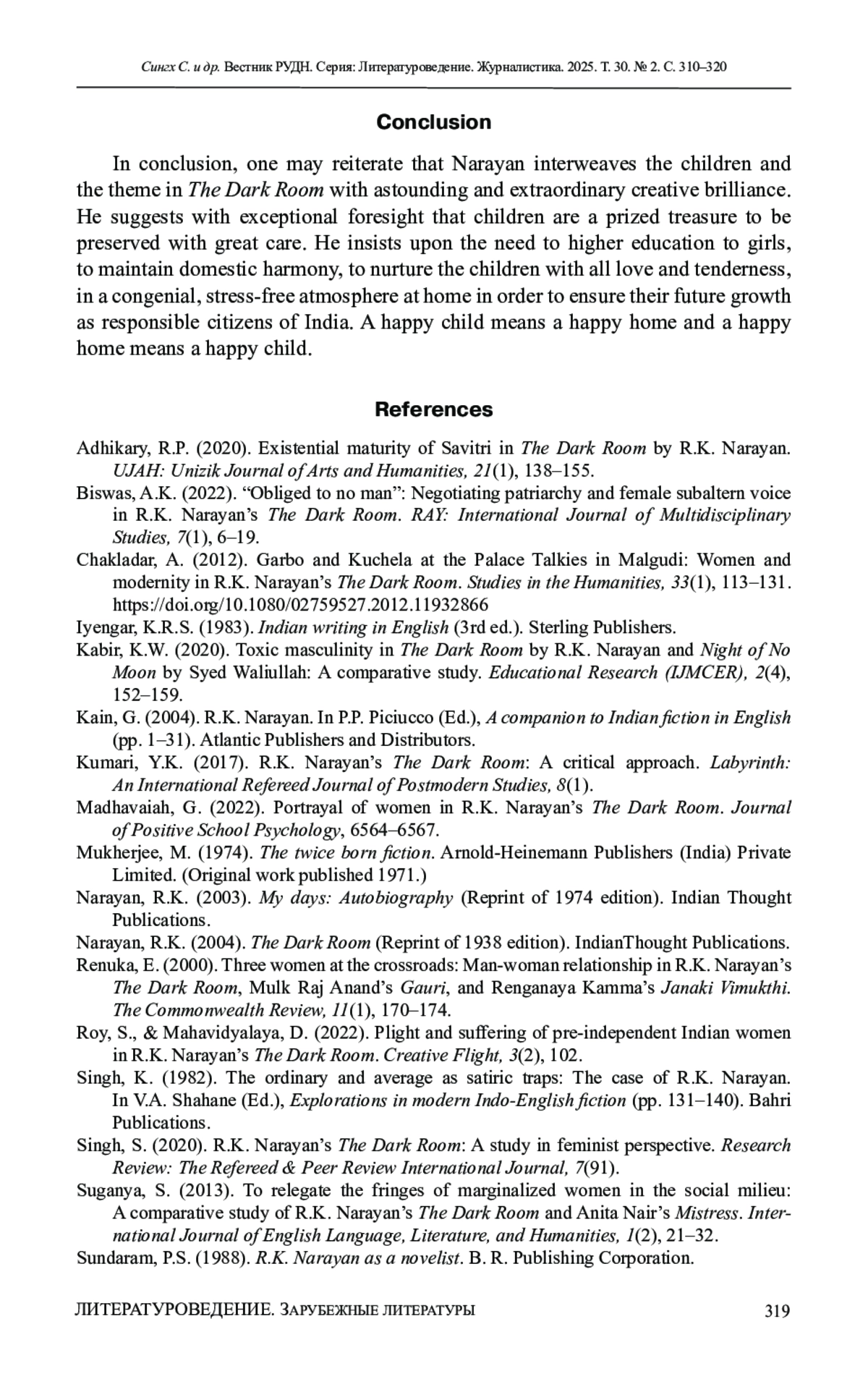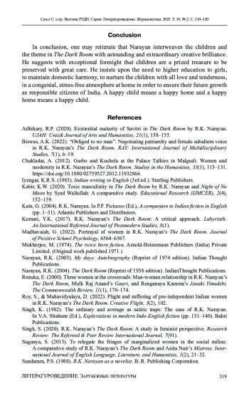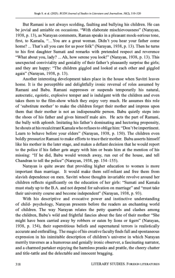 13. Roy, S., & Mahavidyalaya, D. (2022). Plight and suffering of pre-independent Indian women in R.K. Narayan’s The Dark Room. Creative Flight, 3(2), 102.