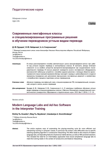 В статье рассматриваются способы автоматизации цикла воспроизведения-записи при работе над устными видами перевода в компьютерных классах. В частности, авторы отмечают сложности из-за особого алгоритма восприятия-воспроизведения при осуществлении последовательного перевода. В поисках решений проводится анализ лингафонного оборудования, возможностей мобильных устройств и способов задания режимов с помощью объектно-ориентированного языка программирования. Авторы приходят к выводу о целесообразности создания программы-посредника для дополнения функционала лингафонных решений в соответствии с потребностями процесса подготовки устных переводчиков.