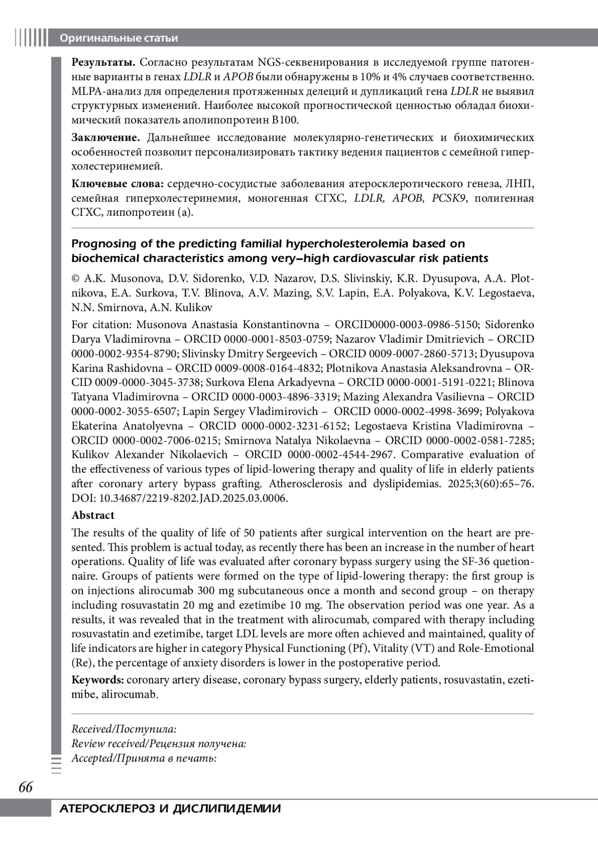 МУСОНОВА А. К., СИДОРЕНКО Д. В., НАЗАРОВ В., СЛИВИНСКИЙ Д. С., ЮСУПОВА К. Р., ПЛОТНИКОВА А. А., СУРКОВА Е. А., БЛИНОВА Т. В., МАЗИНГ А. В., ЛАПИН С. В., ПОЛЯКОВА Е. А., ЛЕГОСТАЕВА К. В., СМИРНОВА Н. Н., КУЛИКОВ А. Н. ВОЗМОЖНОСТИ ПРОГНОЗИРОВАНИЯ СЕМЕЙНОЙ ГИПЕРХОЛЕСТЕРИНЕМИИ НА ОСНОВАНИИ БИОХИМИЧЕСКИХ ОСОБЕННОСТЕЙ У ПАЦИЕНТОВ ВЫСОКОГО И ОЧЕНЬ ВЫСОКОГО СЕРДЕЧНО // АТЕРОСКЛЕРОЗ И ДИСЛИПИДЕМИИ. 2025. № 3 (60)