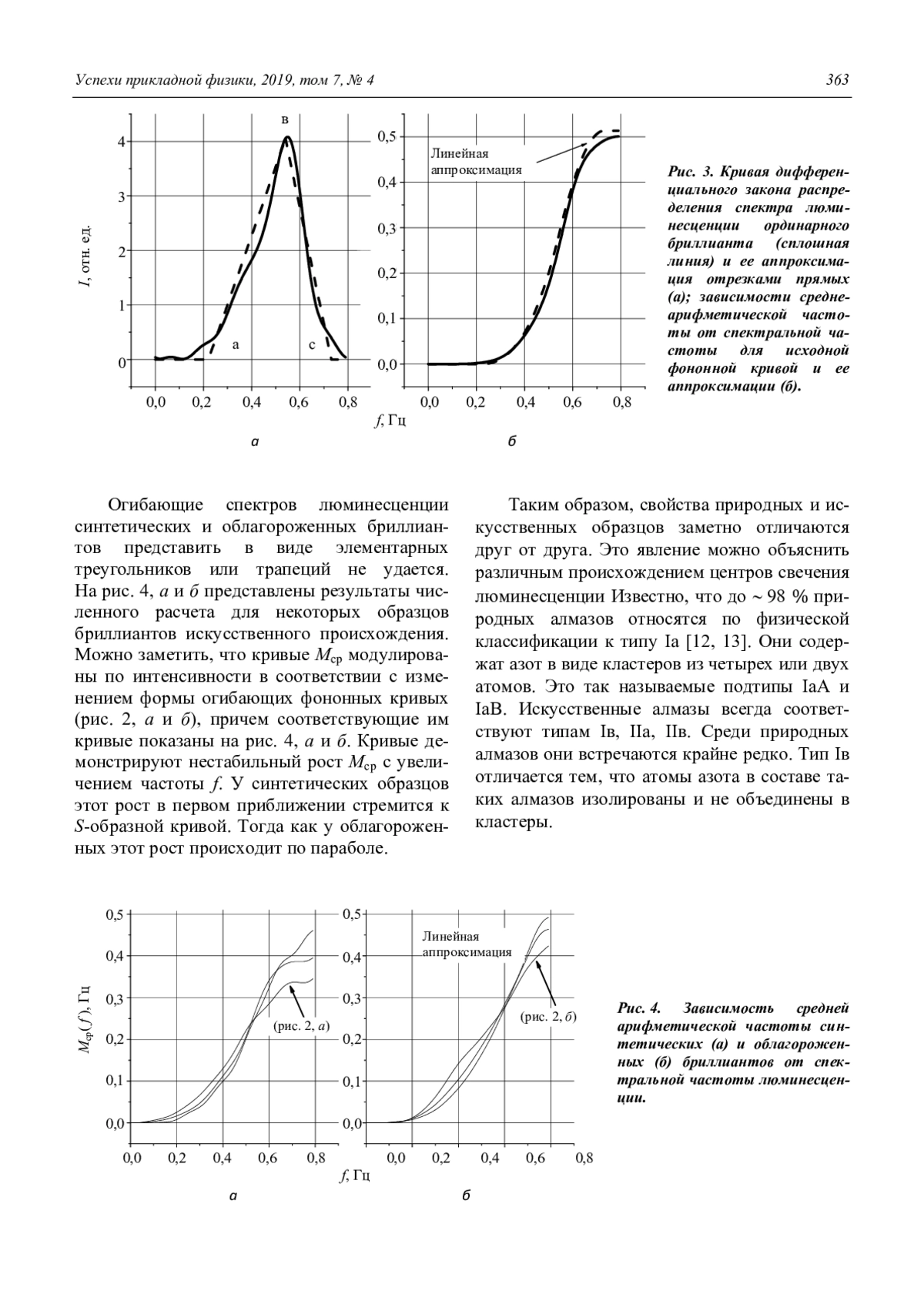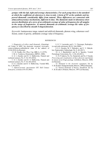 Впервые выполнено исследование фононных крыльев (ФК) спектров люминесценции, при комнатной температуре алмазов, изготовленных в природных (27 образцов) и лабораторных (14 образцов) условиях. Установлено, что по форме фононного крыла и положению его «центра тяжести» по оси частот природные алмазы делятся на три группы: с левой, правой и средней характеристиками. Для каждой группы существует свой эталон, у которых коэффициент когерентности близок к единице. Форма ФК у синтетических и облагороженных алмазов заметно отличаются от природных алмазов. Эти отличия связаны с разными по времени механизмами алмазообразования. Алмазы, изготовленные в лаборатории, демонстрируют неравномерное распределение кривой среднего арифметического значения частоты для всех образцов в диапазоне частот. У природных алмазов среднее арифметическое значение частоты описывается гладкой S-образной функцией.