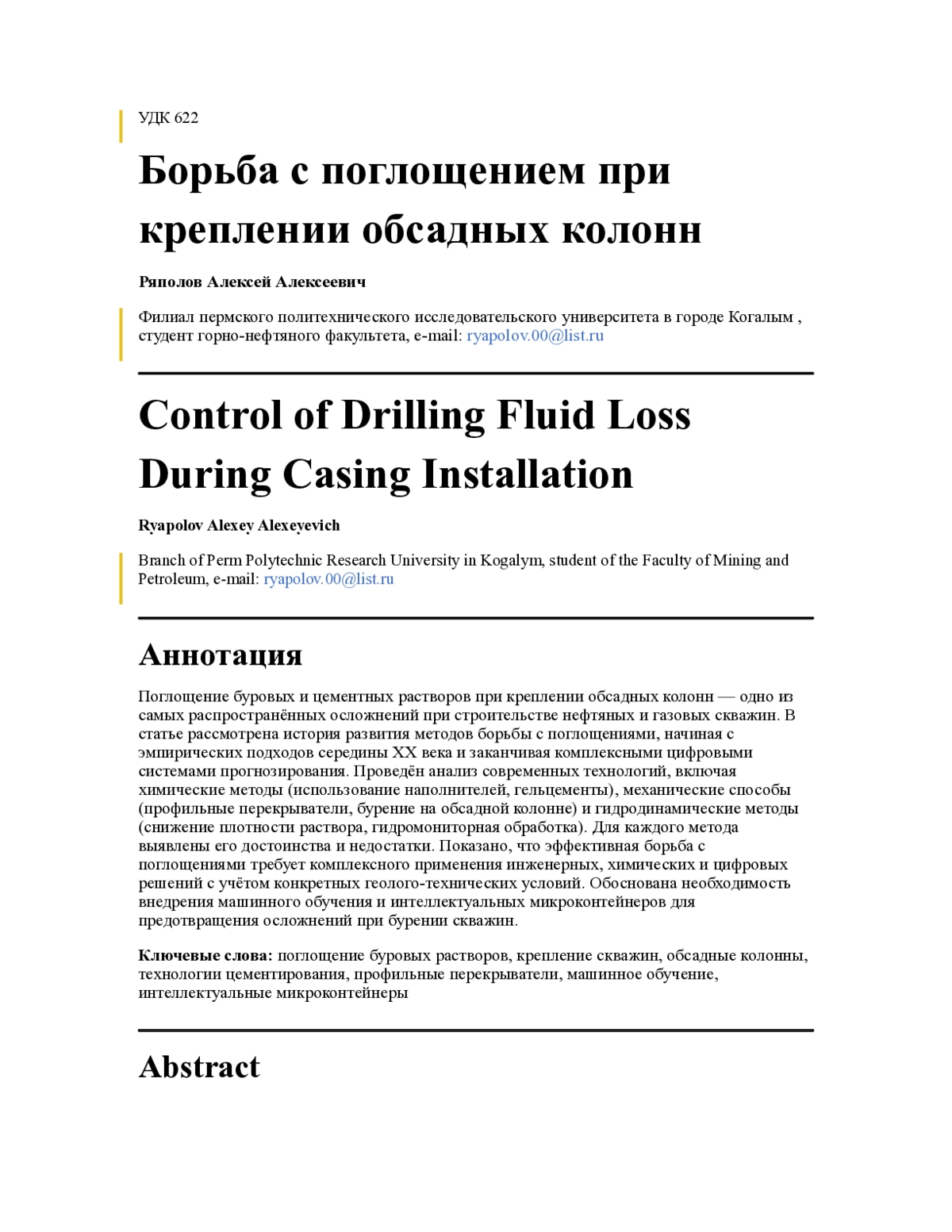 В статье рассматривается проблема поглощения бурового раствора при креплении обсадных колонн в условиях осложнённого разреза. Приведён анализ распространённых причин возникновения поглощений и их влияния на качество цементирования и надёжность крепи скважины. Оценены возможности применения традиционных и специальных тампонажных материалов, а также технологических приёмов по снижению потерь раствора в поглощающих интервалах. Предложены направления совершенствования технологии крепления обсадных колонн, позволяющие повысить герметичность заколонного пространства и снизить риск дальнейших осложнений в процессе строительства и эксплуатации скважин