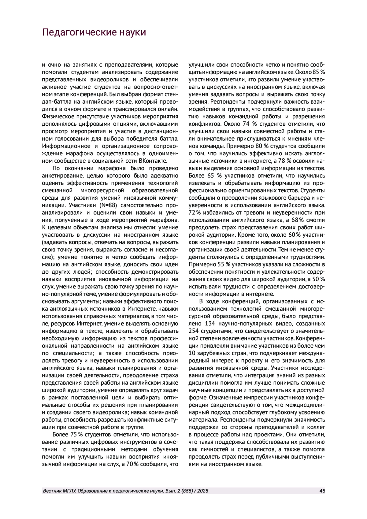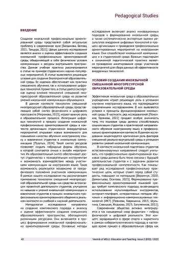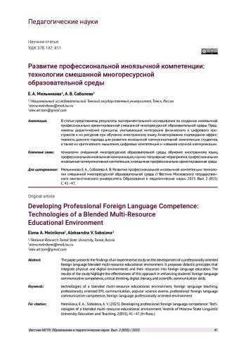 В статье представлены результаты экспериментального исследования по созданию иноязычной профессионально ориентированной смешанной многоресурсной образовательной среды. Предложены дидактические принципы, учитывающие интеграцию физического и цифрового пространств и их ресурсов при обучении иностранному языку. Анкетирование подтвердило эффективность данного подхода для развития иноязычной коммуникативной компетенции студентов, а также их критического мышления, цифровых компетенций и навыков научной коммуникации.