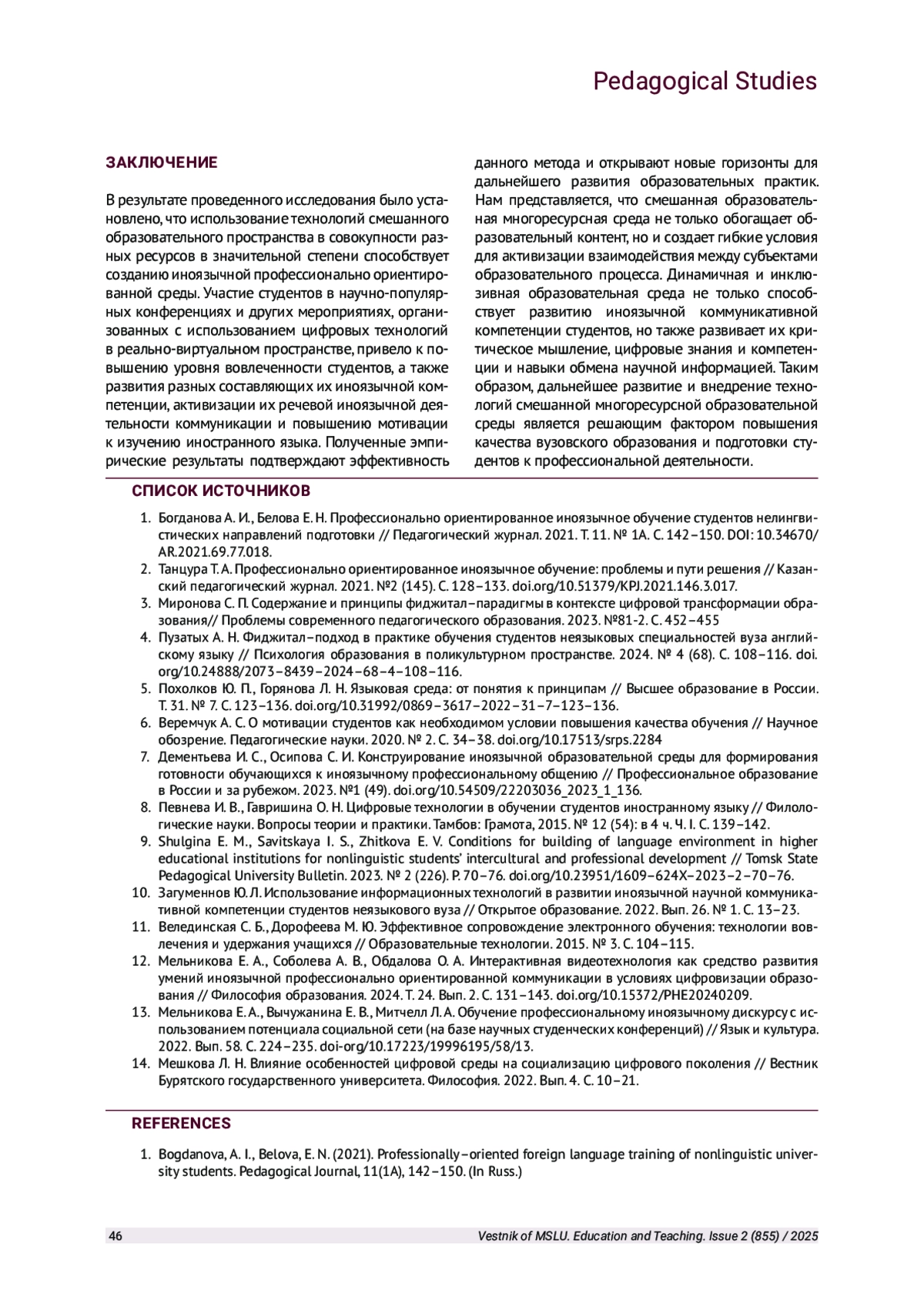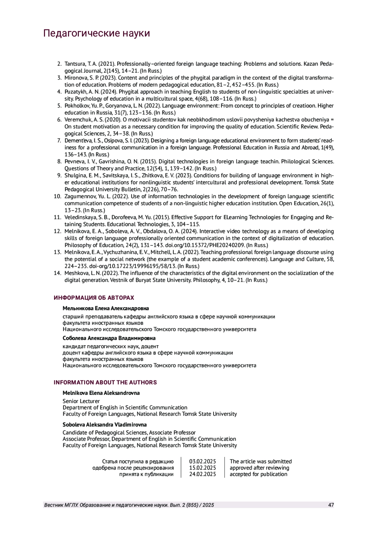 9. Shulgina E. M., Savitskaya I. S., Zhitkova E. V. Conditions for building of language environment in higher educational institutions for nonlinguistic students’ intercultural and professional development // Tomsk State Pedagogical University Bulletin. 2023. № 2 (226). P. 70-76. DOI: 10.23951/1609-624X-2023-2-70-76 EDN: ZRYNSG